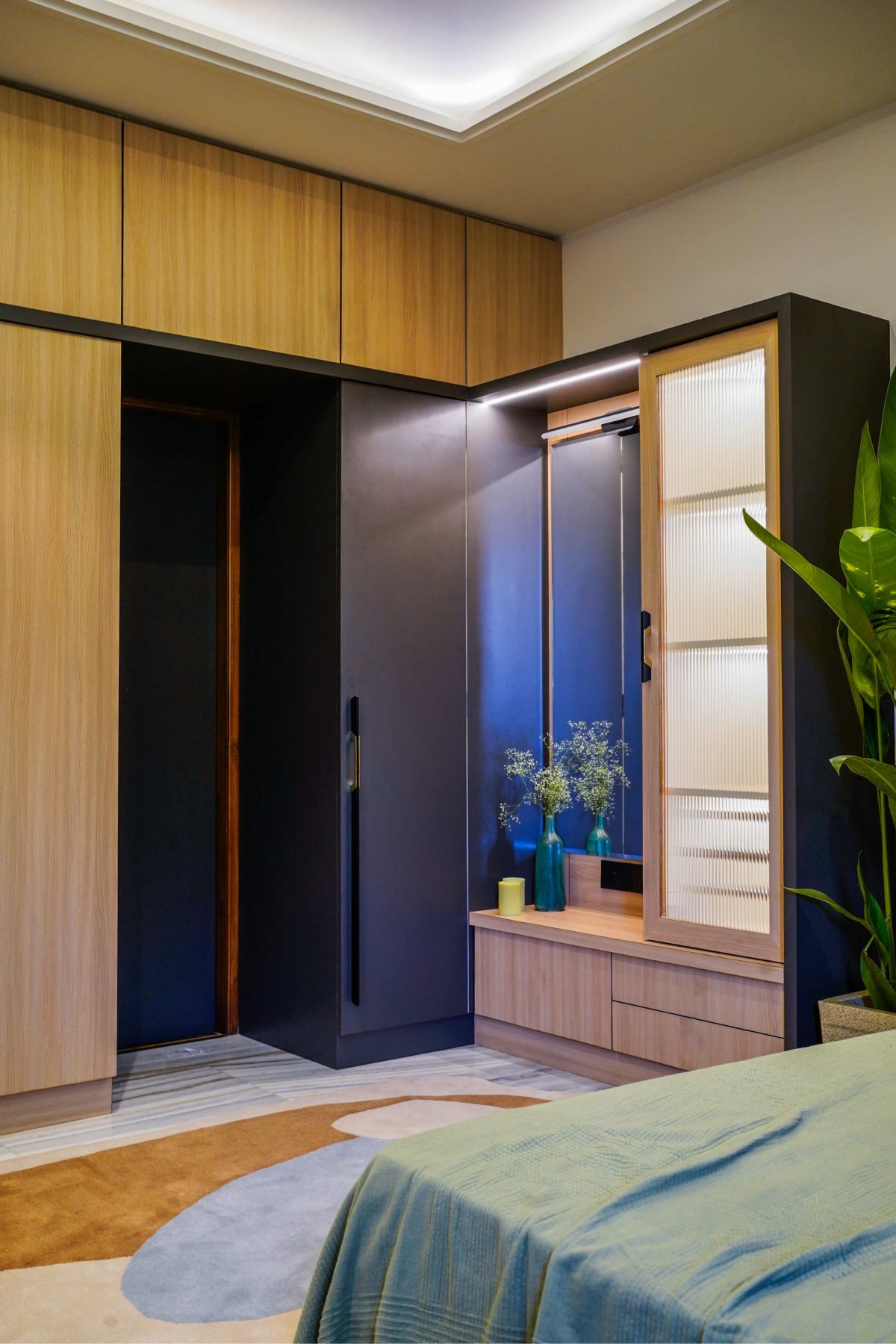 The elder son’s bedroom carries forward Studio Timescape’s ethos of crafting spaces that are as serene as they are striking. Here, geometry becomes both structure and ornament. The bed’s backdrop is defined by a sweeping arched panel with soft grooves, illuminated with concealed lighting that transforms it into a glowing halo. This subtle architectural gesture elevates the room from ordinary to sculptural, allowing the walls themselves to participate in the design.