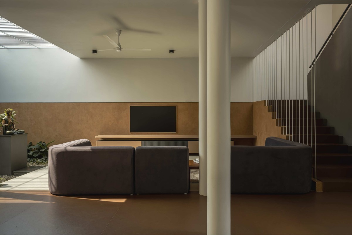 The journey into the house begins modestly, through a picket gate that leads directly into a corridor the spine that gives the home its identity. From the very first step, one experiences the intent of the design, a spatial sequence that flows inward, layered with light, privacy, and connection. On the left, a serene courtyard serves as a pooja space, where morning light filters softly through the perforated pergola above. Moving forward, still along the corridor, lies the family living room, a warm gathering space that opens up to pockets of green, creating a continuous visual dialogue with nature.