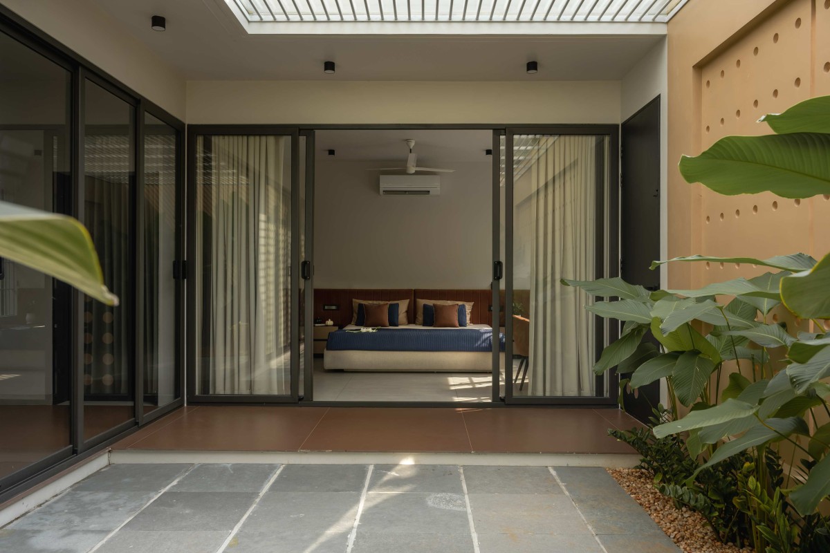 The material palette of the house complements its philosophy subtle, grounded, and timeless. Textured finishes, muted tones, and clean lines dominate the composition, allowing the play of light to animate the surfaces throughout the day. The perforated walls cast moving shadows that change with time, giving the architecture a living quality.