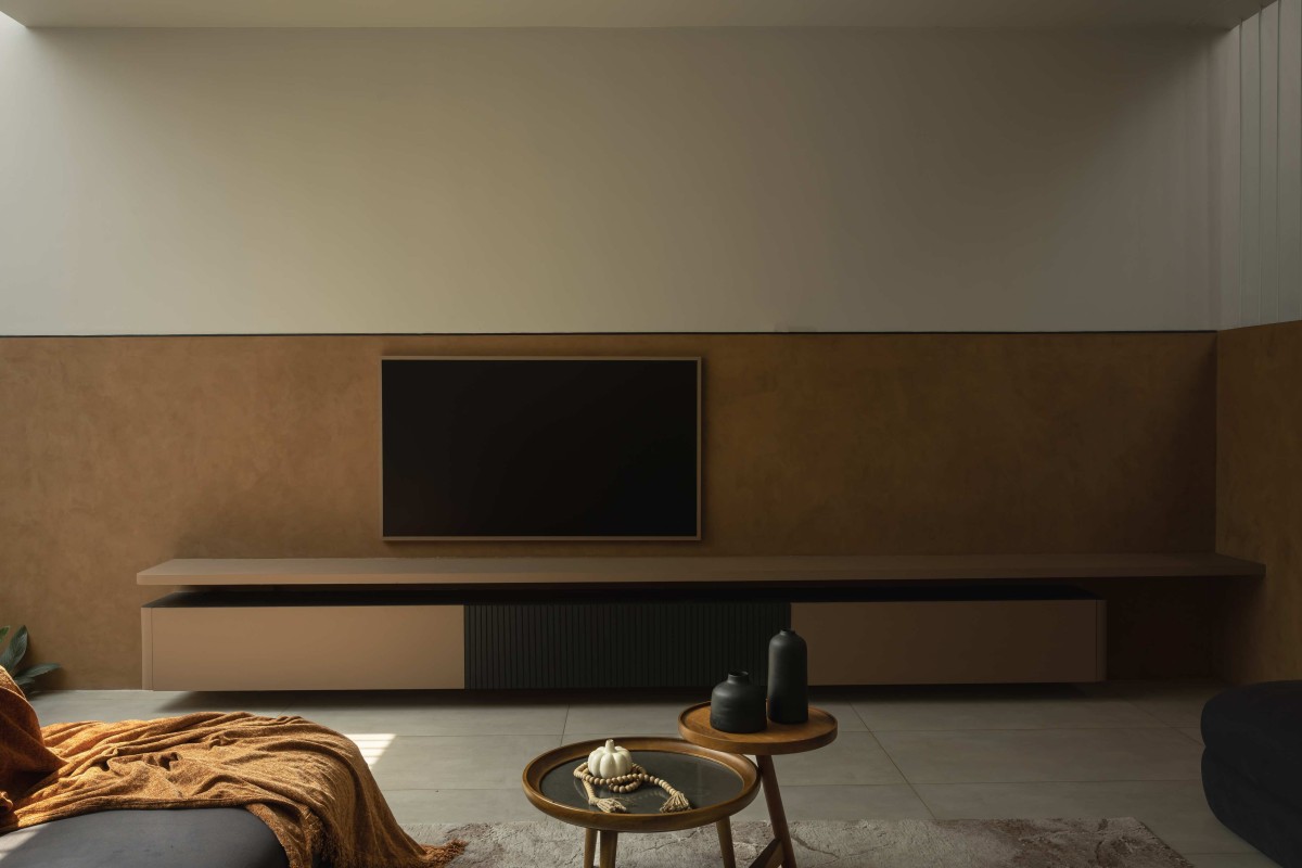 The combination of ochre walls, wood, stone, and greenery establishes a mood that is earthy yet refined balancing privacy with warmth. The textures interact beautifully with natural and artificial light, giving the home a quiet glow at dusk.