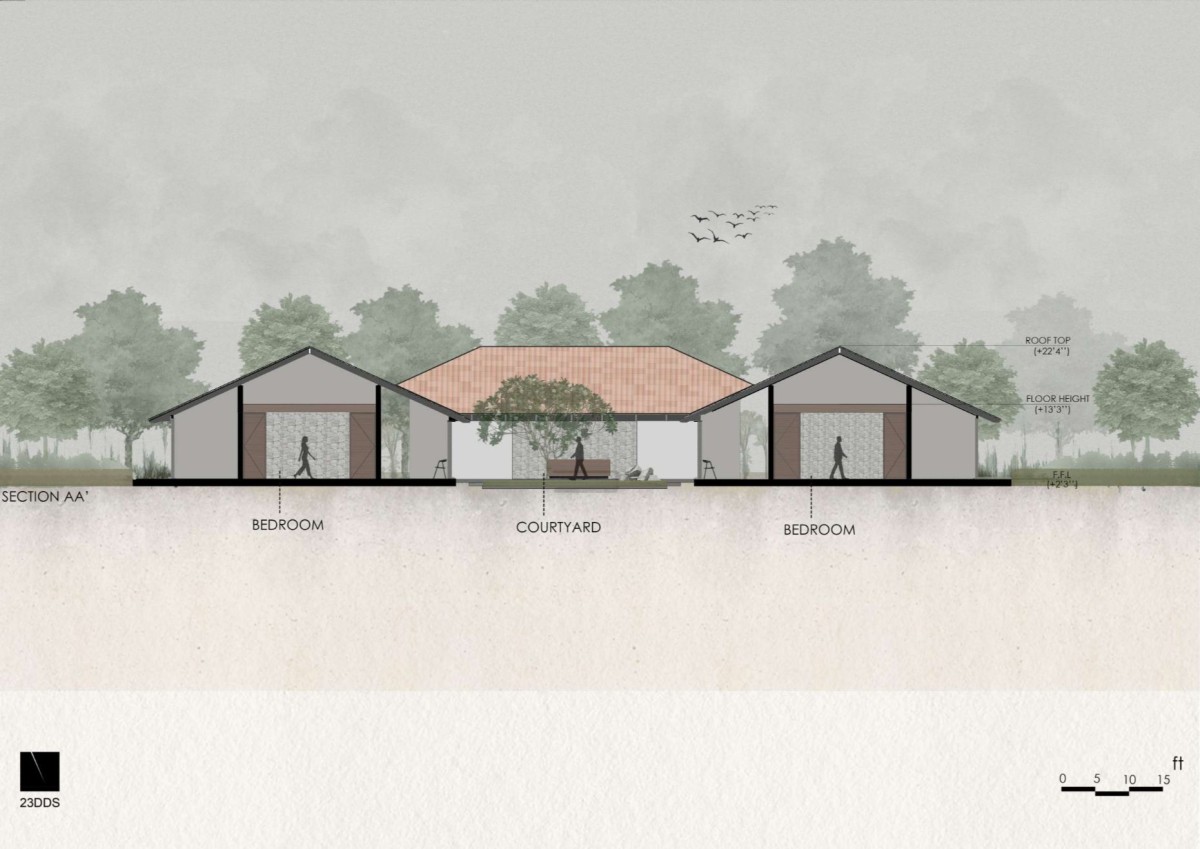 The brief provided by the client envisioned the expansion of a single bedroom farmhouse into a place where his extended family could live within the tranquil company of nature. This called for the addition of six bedrooms along with a fully functional kitchen and dining area, and expansive areas for communal living. The need for privacy and socialising further required the design to provide green areas for each room, along with seamless connectivity to communal open spaces. This requirement of the brief was resolved by reinterpreting the traditional 'manduva house'.