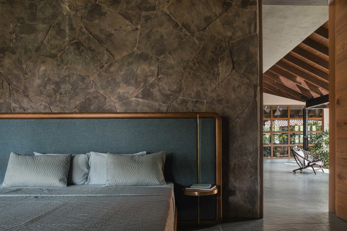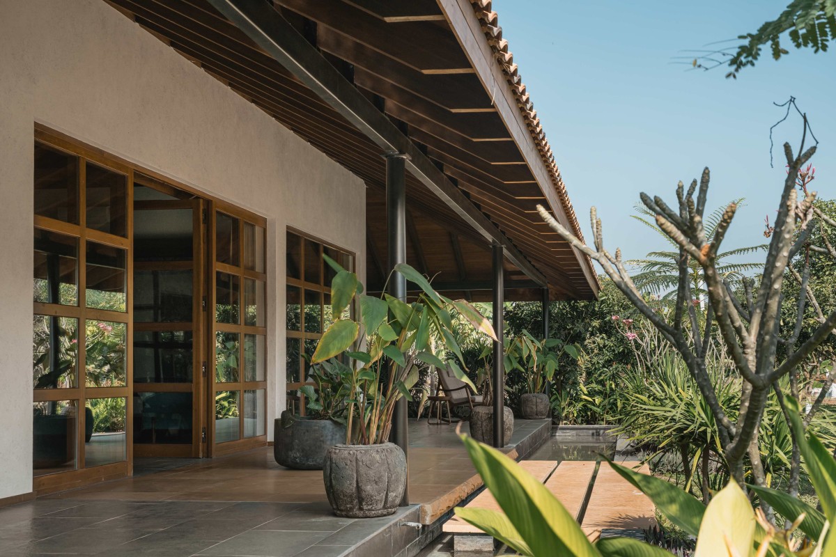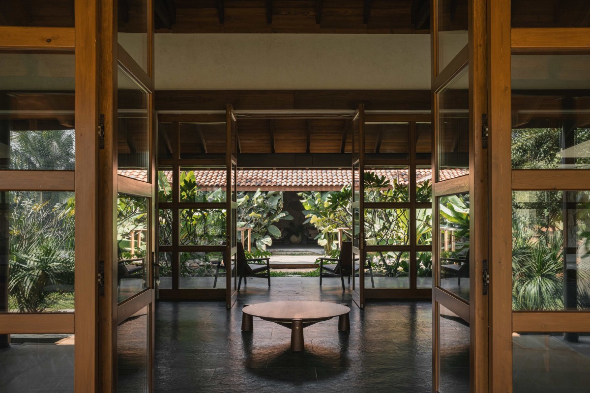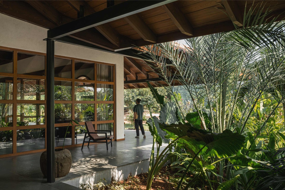 The courtyard, an integral part of Manduva house, has been reinterpreted to accommodate the elements of modern rural living. By strategically detaching the four blocks around the central courtyard, as opposed to a traditional courtyard layout, the design allows natural ventilation from all directions, enhancing airflow and overall comfort. This spatial organisation also prioritises the client’s need for solitude, and social interaction whilst retaining the connection with nature. To achieve a unified look, the roof has been fragmented into four smaller sections contained under a single roof. Constructed entirely in wood, without the use of metal structural members, the structure highlights the essence of rural architecture—a building that harmonises with the environment, responds to local climatic conditions whilst relying on its use of natural materials.
