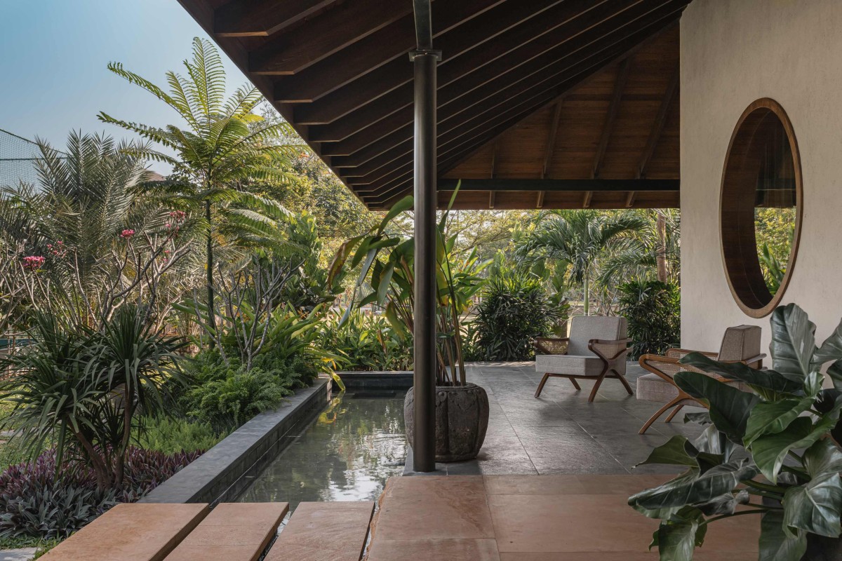 As one approaches the farmhouse through a narrow passage, set within a mango orchard, one is greeted by an inviting building with expansive semi-open verandas. The journey continues across an entrance waterbody onto an entrance veranda, offering a view into the living and dining block. The verandas, sheltered by the extended wooden roof, provide much needed shelter and transition from the outdoors to the indoors.