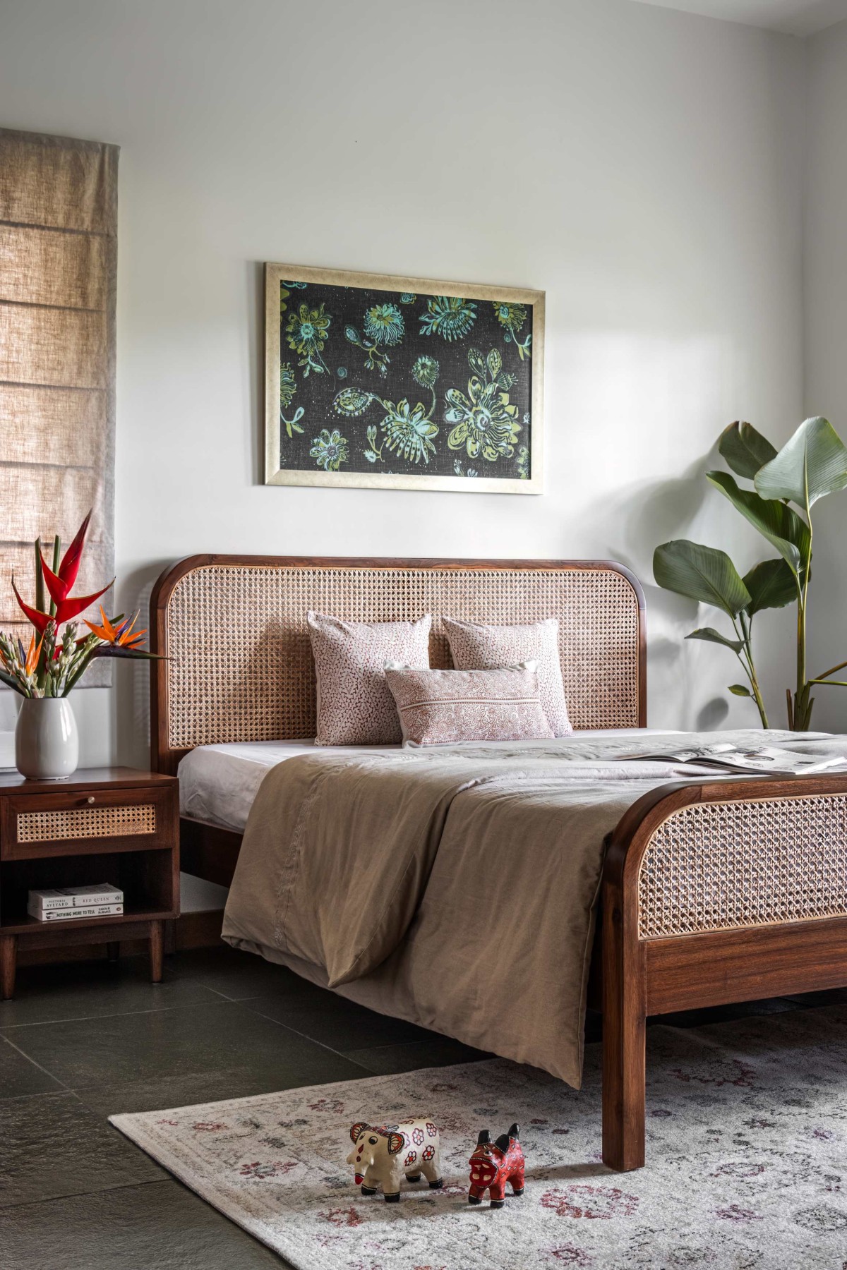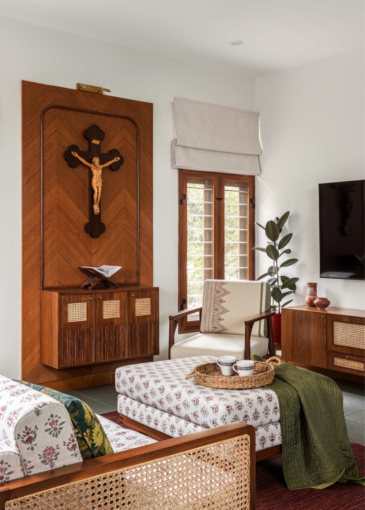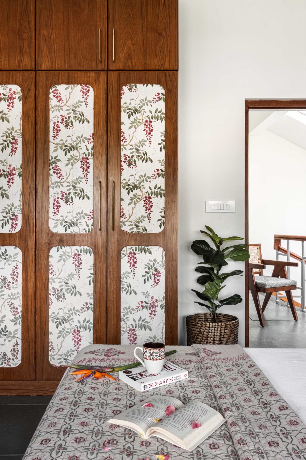 All the bedroom spaces have a touch of artisanal detail to evoke a sense of quiet luxury. Teak wood, known for its richness and durability, is used across various furniture and built-in elements, complemented by the soft gleam of brass accents. These are further softened by block-printed fabric inlays that bring in texture, warmth, and a handcrafted touch. Altogether, these elements come together to shape a calm, serene atmosphere — a peaceful retreat nestled within the busy rhythms of city life, offering a perfect balance between tradition and modern comfort.