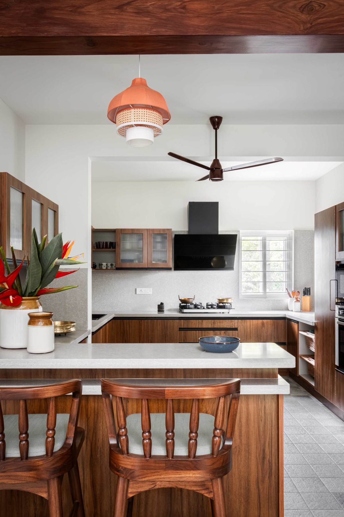 The kitchen was designed with minimalism and functionality in mind. A quartz countertop and backsplash provide durability, while wood-finish laminate and fluted glass upper cabinets add a touch of elegance. The breakfast counter, illuminated by a custom Olie pendant light, introduces a pop of color, creating a cheerful space for family gatherings.