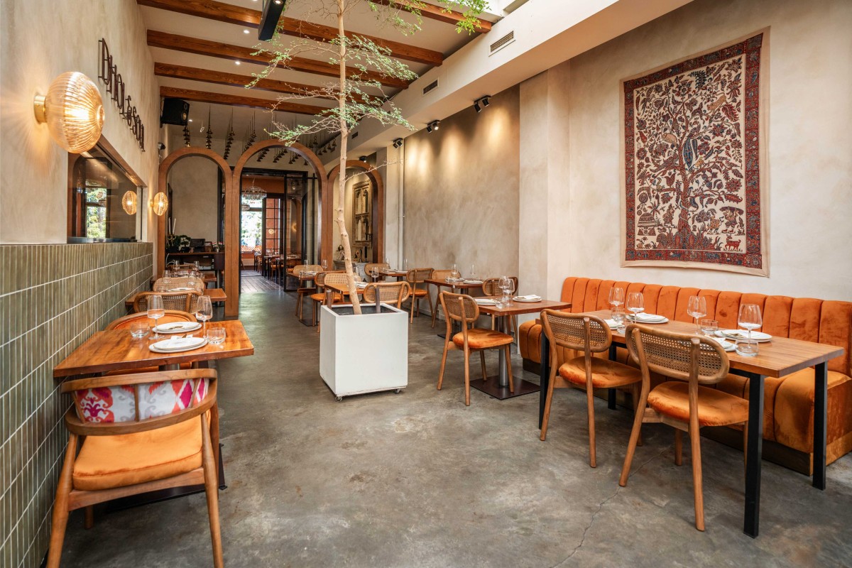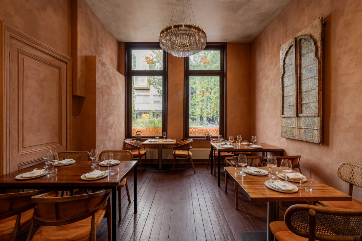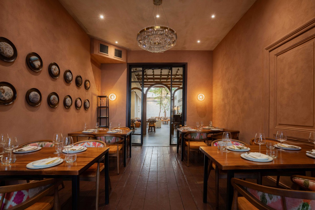 The interior bridges nostalgia and modern design sensibilities. Elegant chandeliers inspired by classic Indian glamour coexist with sleek, contemporary furniture in natural wood and cane. Upholstered seats in warm rust and ochre tones invite comfort, while polished concrete flooring adds a quiet, urban edge. Together, these elements create a layered aesthetic — refined yet rooted, sophisticated yet deeply human.