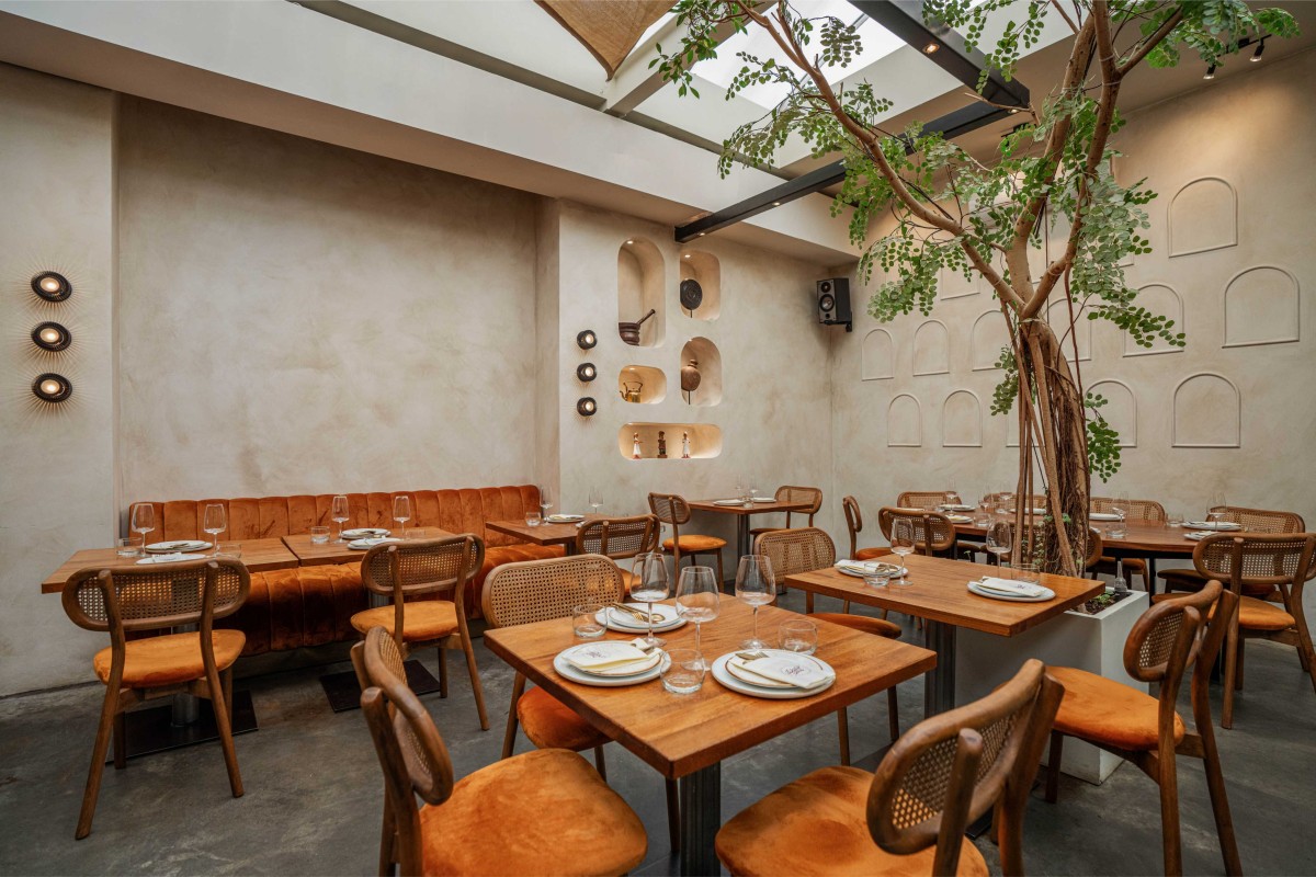 At the heart of the restaurant lies a skylit courtyard — an open, meditative space where a slender tree rises gracefully towards the light. The dappled sunlight streaming through fabric canopies evokes the gentle warmth of an Indian afternoon, transforming the act of dining into a sensory experience. For Studio Knest, this element became the soul of the design — a modern-day reinterpretation of the Indian courtyard, where nature and community seamlessly coexist.