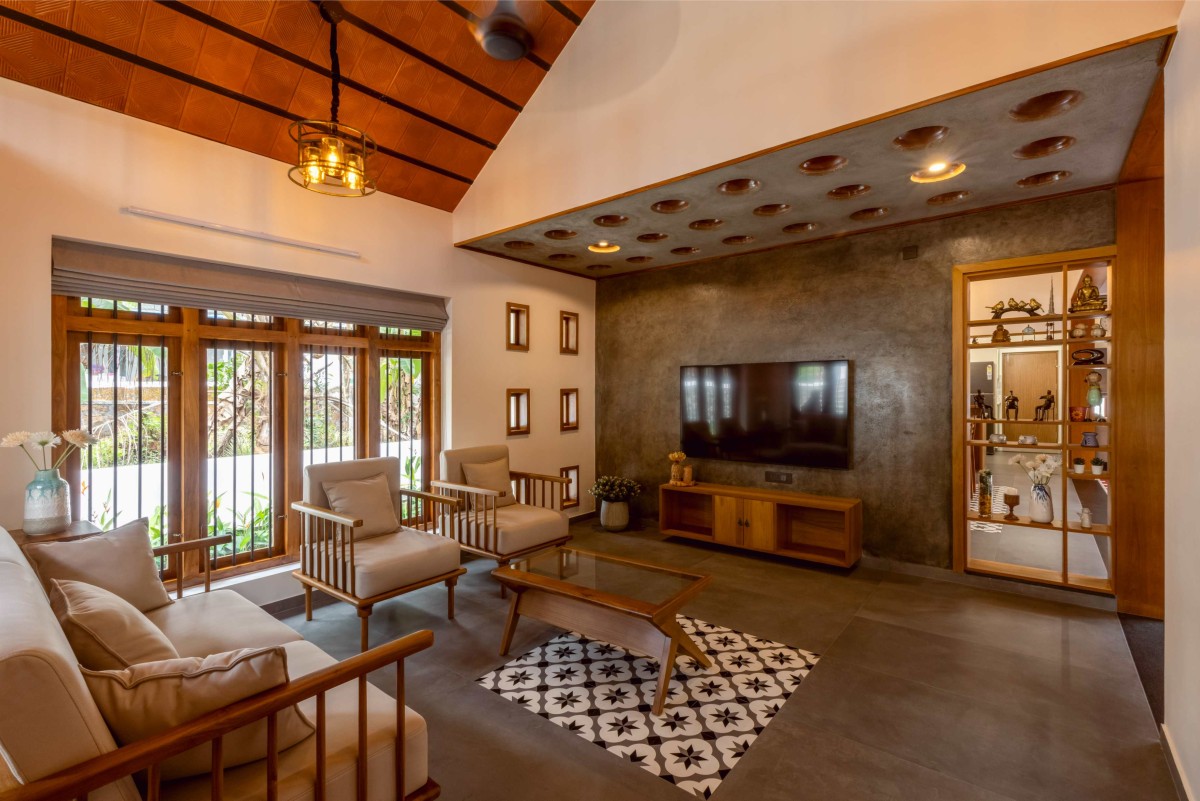 Large openings and cross-ventilation strategies ensure the house remains airy and cool throughout the year—a nod to Kerala’s humid climate. Filtered natural light gently illuminates the interiors, creating a bright and comfortable atmosphere without relying heavily on artificial sources.