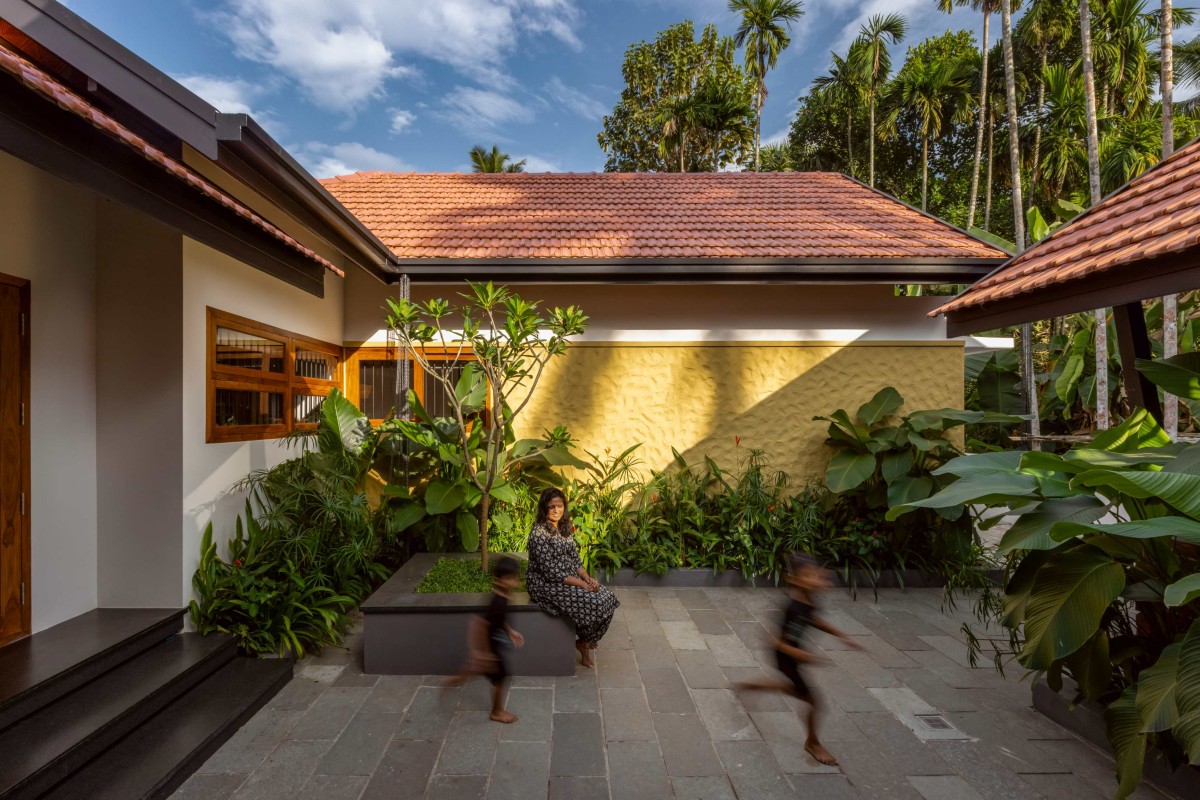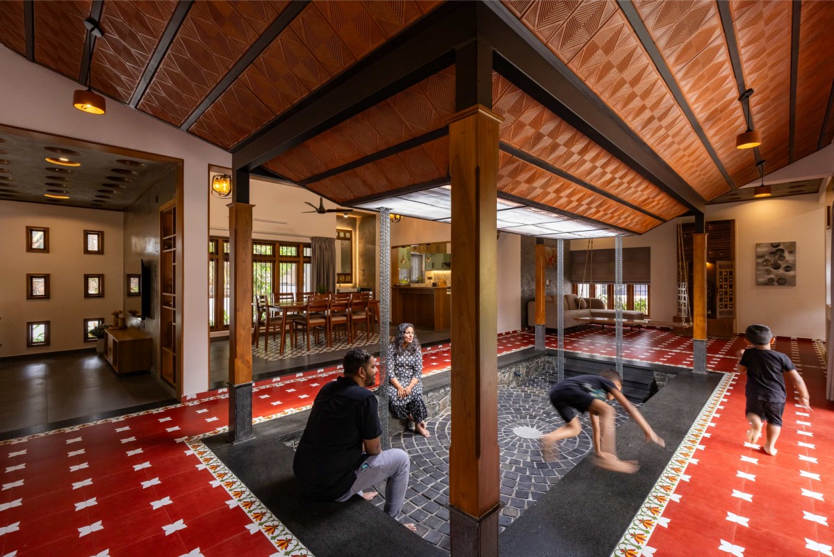 At the core of Dhwani lies an open-to-sky central courtyard, a hallmark of Kerala's domestic architecture. Traditionally used to regulate airflow and provide light, this courtyard becomes the heart of the home, creating a spatial experience that encourages gathering, reflection, and introspection. It blurs the boundaries between the built and unbuilt, allowing nature to become a vital part of the interior dialogue.