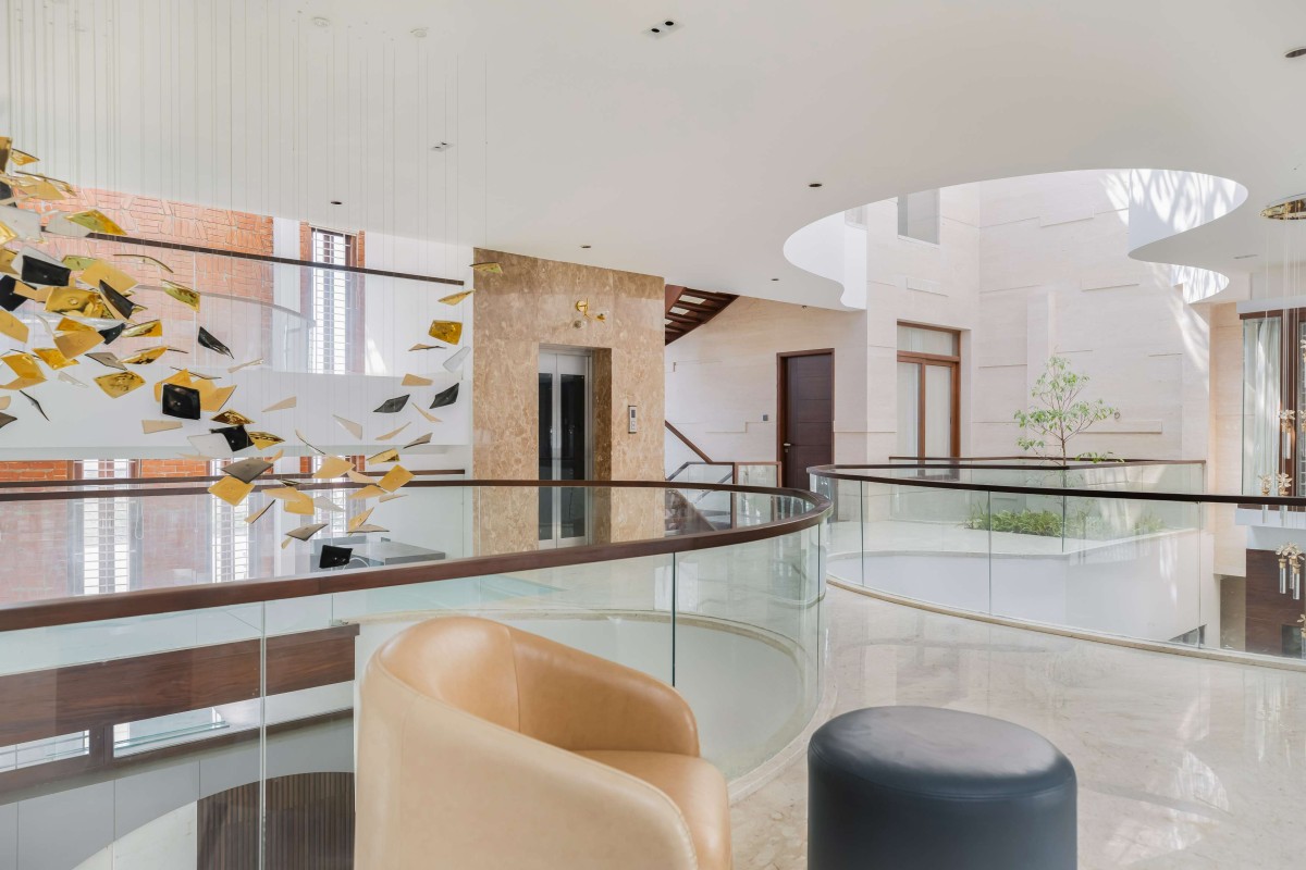 Designed for a multi-generational family of doctors, the 9,000 sq. ft. home fosters connection and calm amidst busy professional lives. Central to the design is a striking column-free Muttram (courtyard) that invites natural light, air, and greenery deep into the interiors.