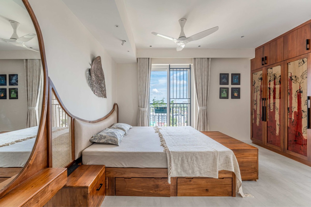 In the bedroom, cane wardrobes and wooden furnishings were combined with subtle oxidized wall features, creating a tranquil and serene environment. The addition of banana fibre art pieces on the walls added a touch of lightness and modernity to the space.