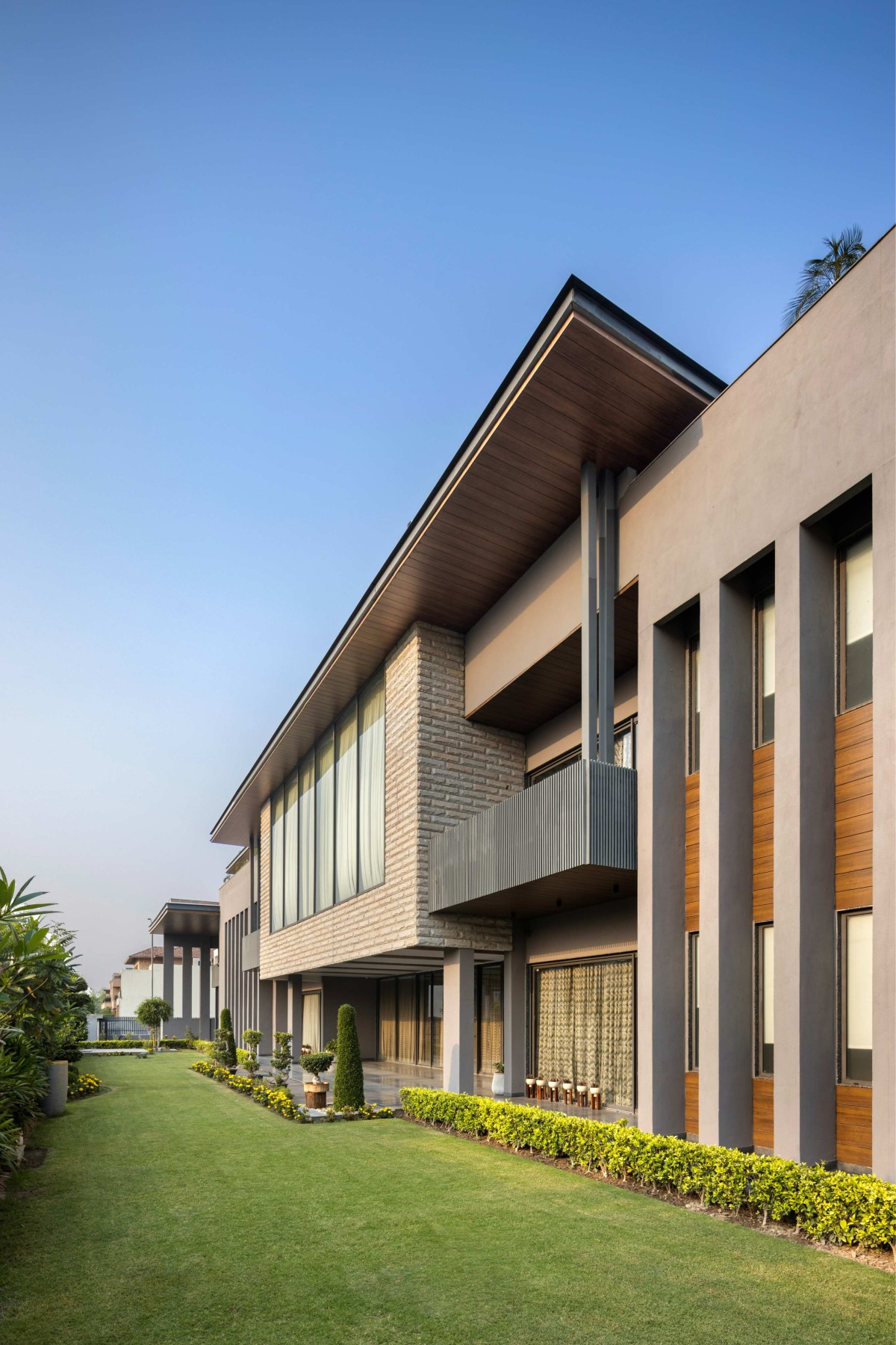The site presented two major constraints. It is west facing, and the plot depth is limited. Given Amritsar’s hot climate, the western façade required careful environmental control. Smaller window openings, vertical louvers, and deep verandahs are used to reduce heat gain while allowing filtered light and ventilation. The shallow depth of the plot required a reduction in the front lawn dimension, but spatial continuity is maintained through visual alignment and strategic landscape planning.