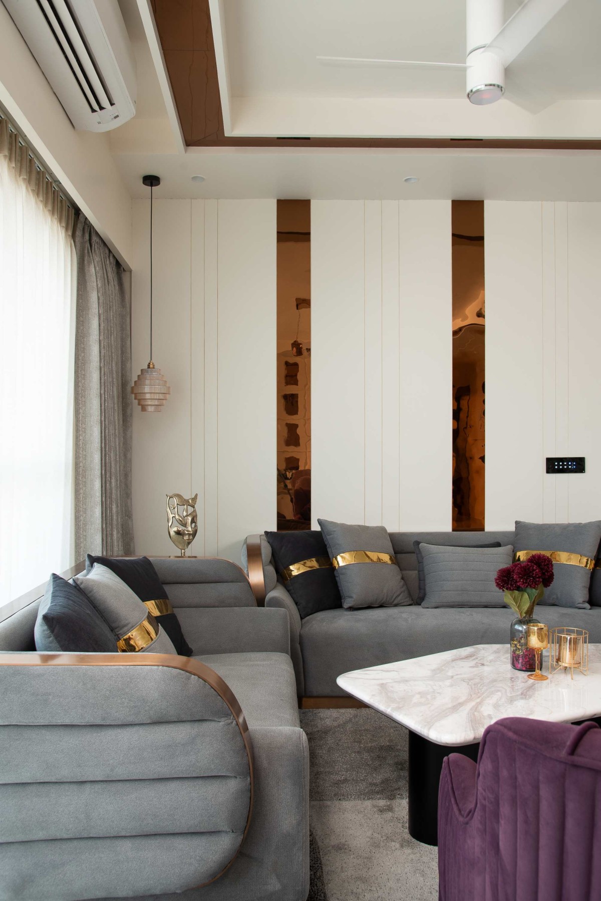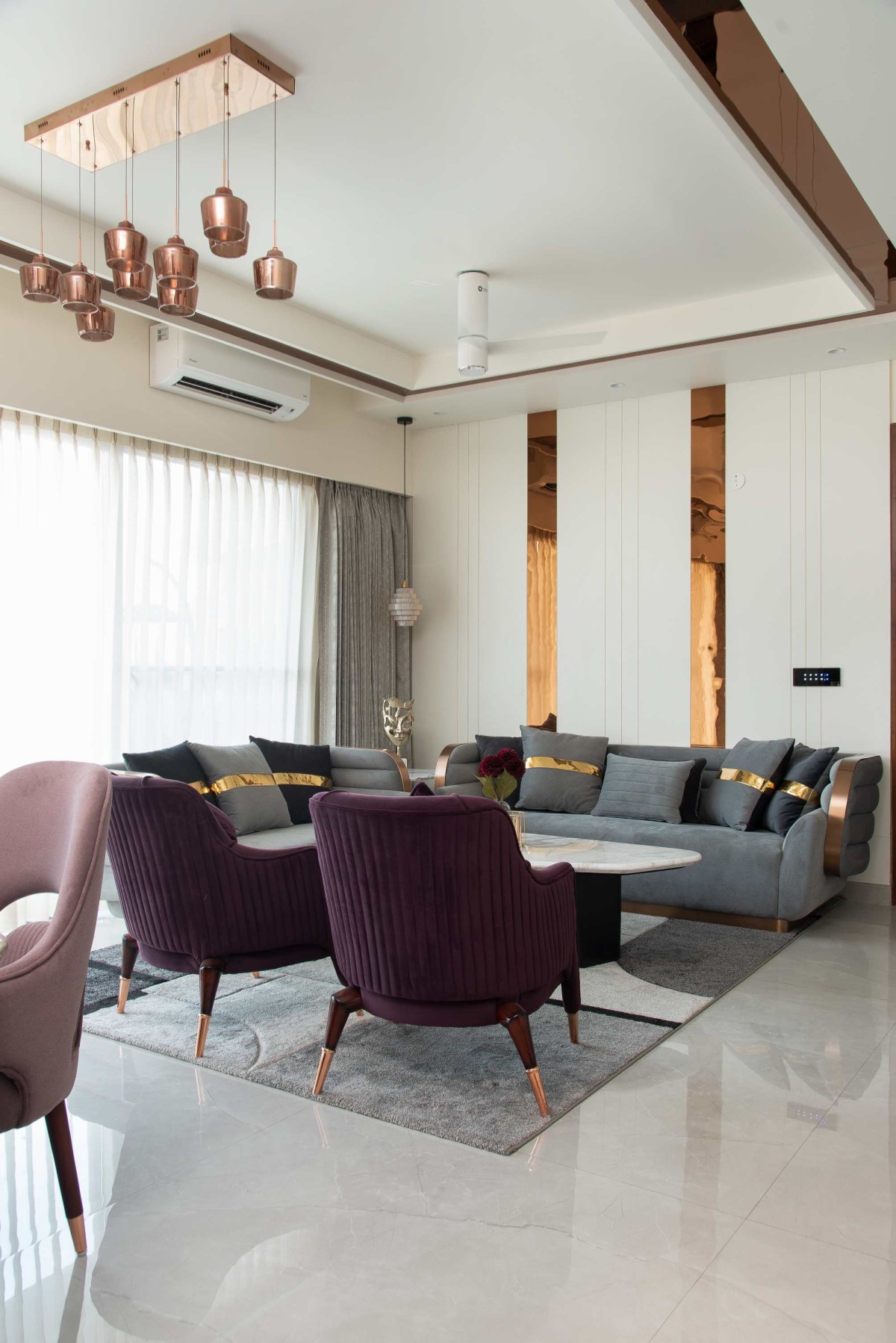 Elegance Abode is a 2,200-square-foot apartment designed to embody the essence of modern contemporary living. The home is a harmonious blend of sophistication, functionality, and personal expression, tailored to reflect the unique personalities of its occupants. From the moment you step into the living-dining area, you are greeted with an air of luxury and grandeur, setting the tone for the rest of the home.