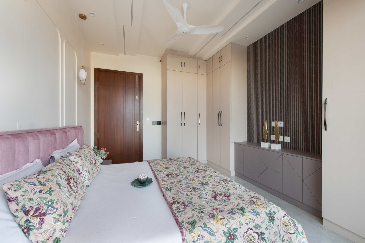 The master bedroom is a sanctuary of tranquillity, designed in neutral shades to promote relaxation and restfulness. The design prioritizes functionality without compromising on aesthetics. Every element in the room, from the custom-built wardrobes to the subtle lighting, is meticulously chosen to enhance the overall sense of calm. The space is tailored to cater to the needs of the homeowners, offering a perfect balance between comfort and style.