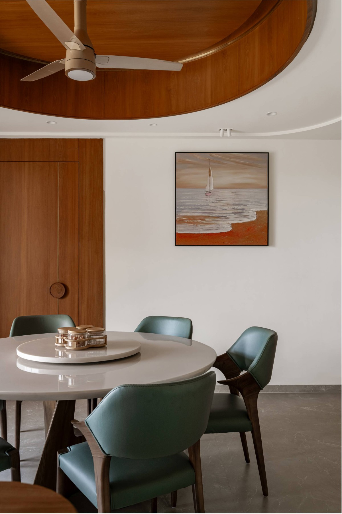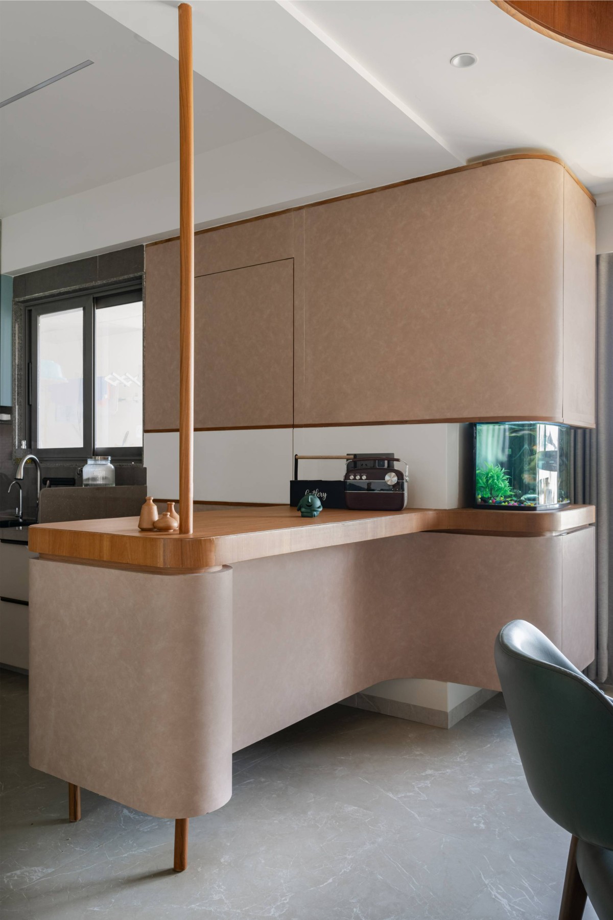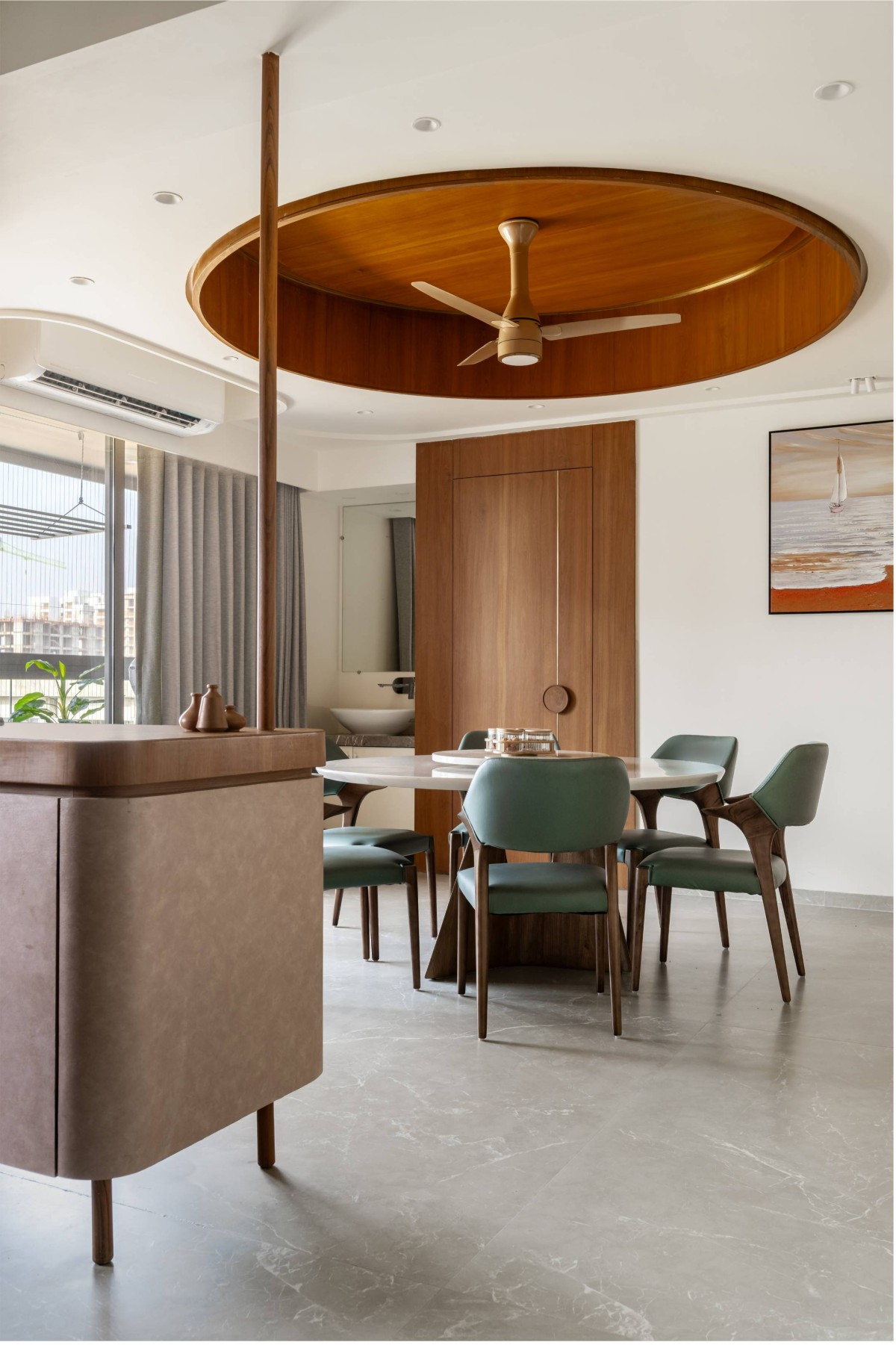 The custom furniture pieces, such as the circular dining table and floating breakfast unit, balance utility with ease of maintenance and human circulation.