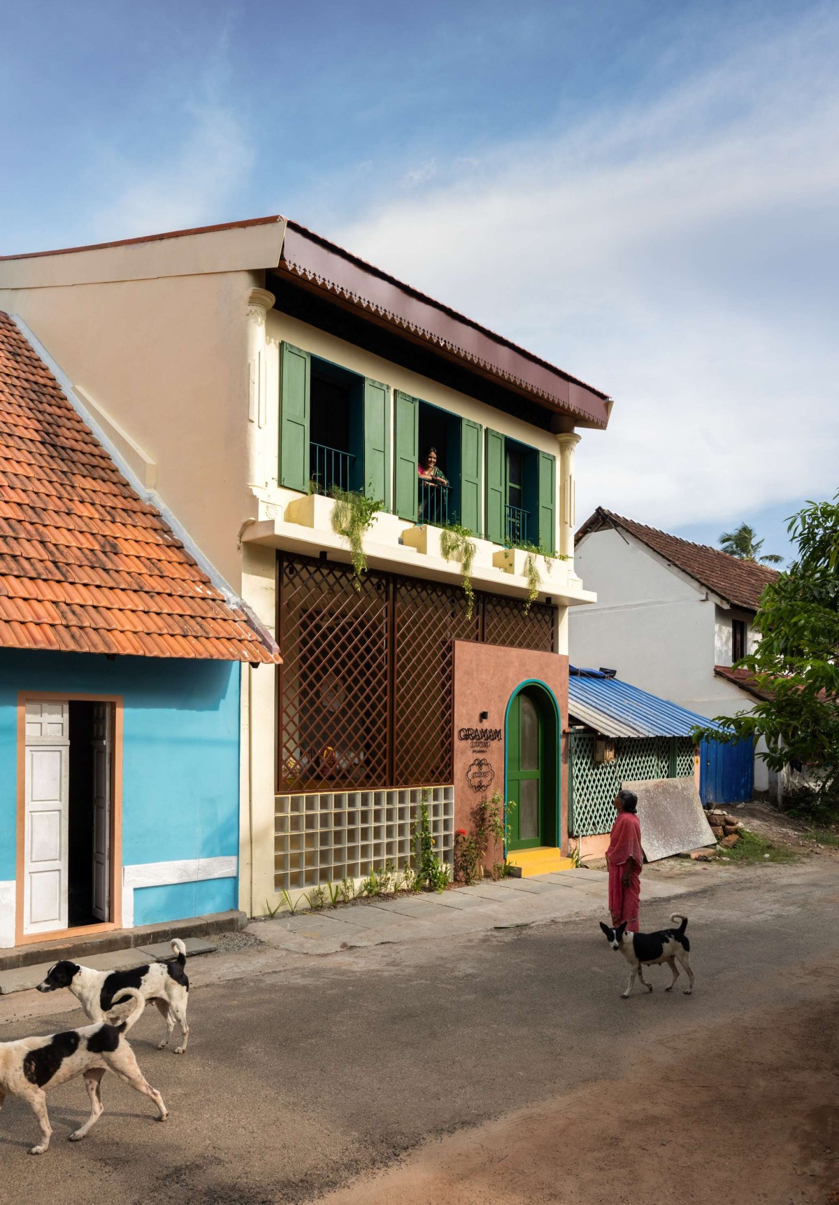 Wooden elements, kolam motifs, and handcrafted details are complemented by landscaping and visual cues drawn from familiar regional flowers such as thetti and hibiscus. These elements subtly reinforce the project’s name—Gramam—anchoring it firmly in a sense of place and collective memory.