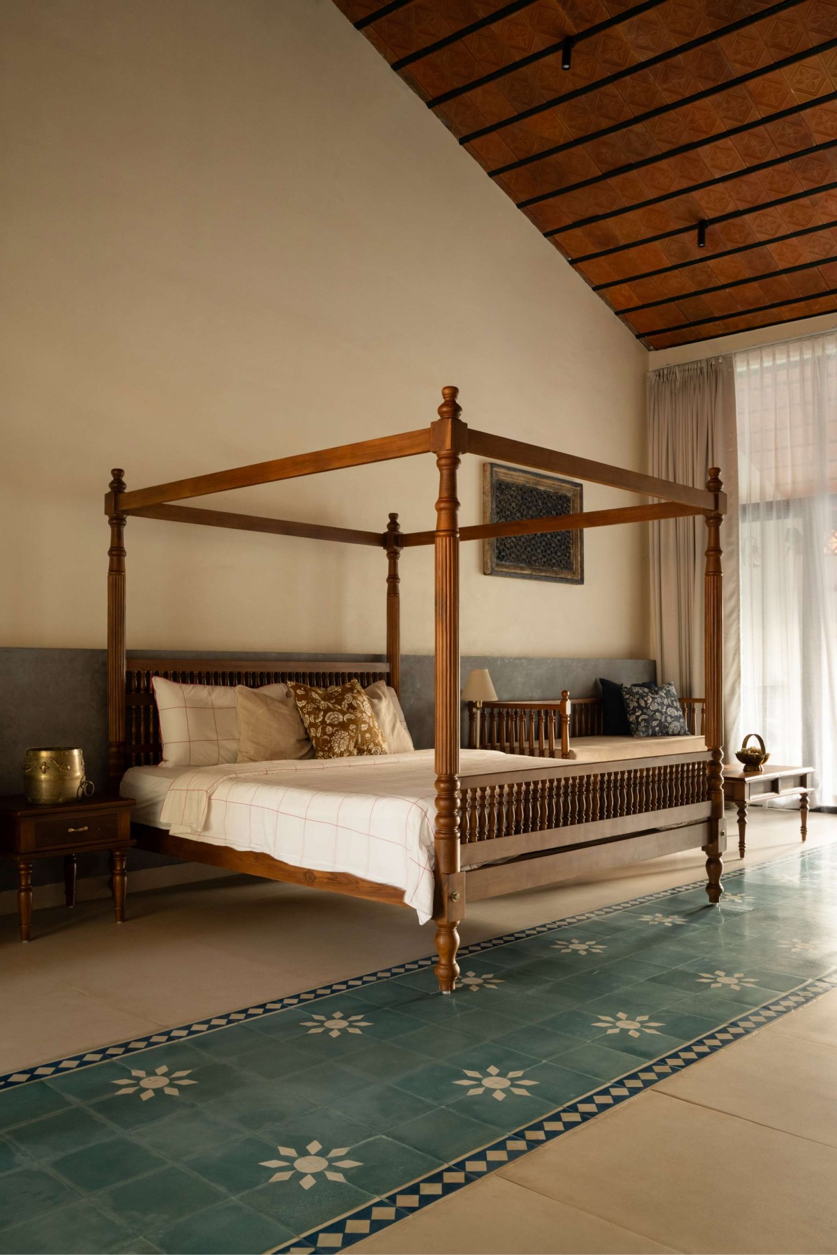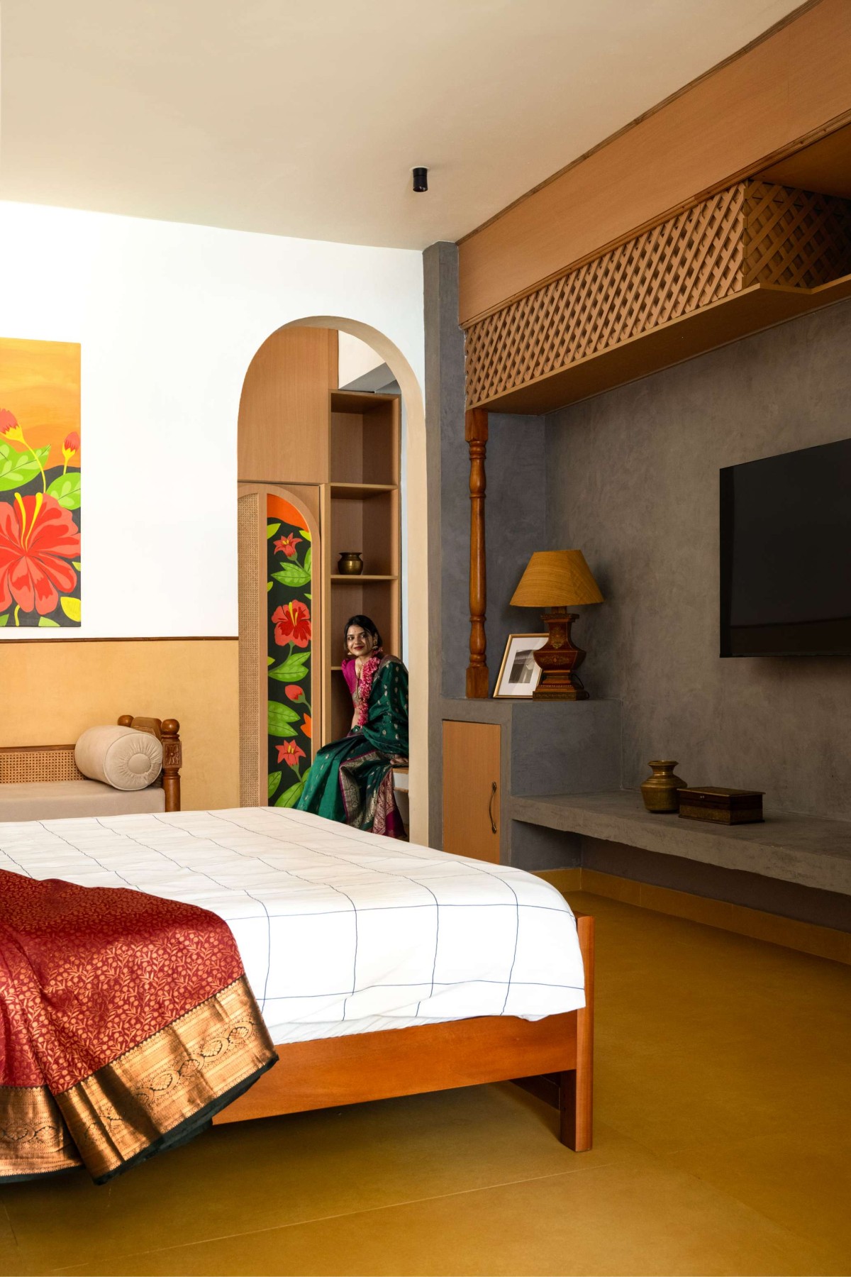 The three guest rooms are generous in scale, each expressing a distinct variation of the same overarching theme. While the client brought in numerous visual references from social media, the design process focused on distilling these inspirations into a cohesive language—one that feels elegant yet unpretentious. The resulting aesthetic is an amalgamation of agraharam-inspired patterns and details, layered with references to hyper-local flora.