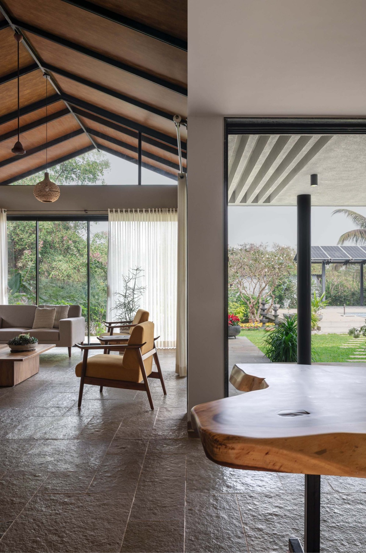 Responding to the heavy Monsoon rains, the gable roofs over each block imbibe one of the vernacular roof profiles prevailing in the region. The deep roof overhangs compliment the large north openings to limit heat gain into the building. Tall trees on the west and south add to this cause. The house celebrates Indian stone flooring with an abundant use of Shabad slabs in the majority of the spaces. The interior design of the house is eclectic and elaborate mirroring the clients taste in timeless wooden furniture, textiles and décor. The palette effortlessly accommodates several heirloom furniture pieces from the clients' home in Kanpur, adding a strong layer of family's identity to the home. The indirect roof lighting and curated artworks are warm up the spaces making them unique.