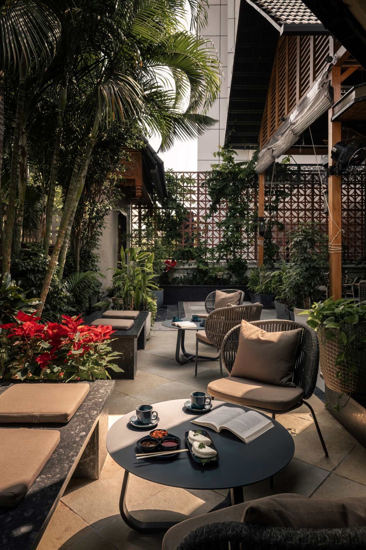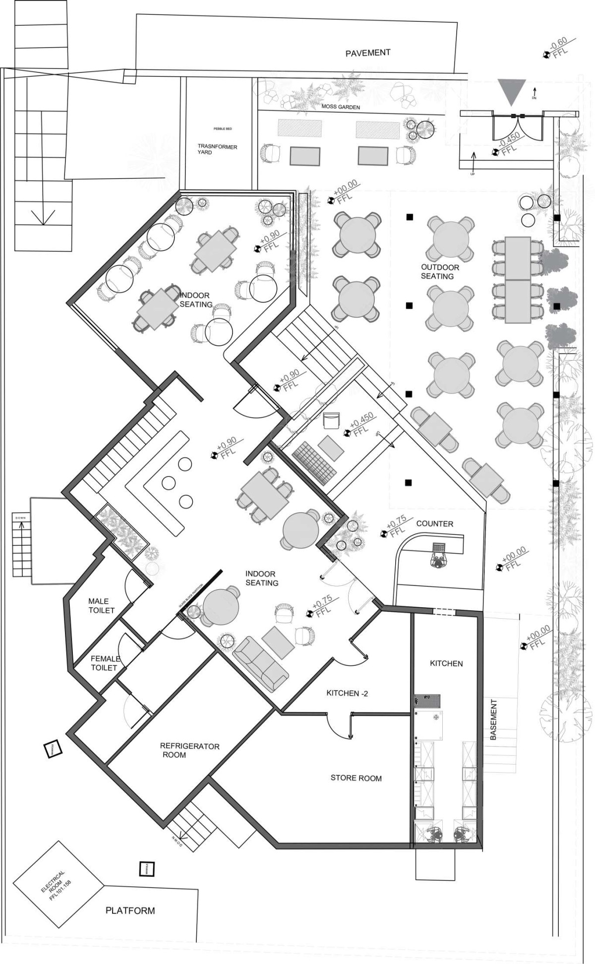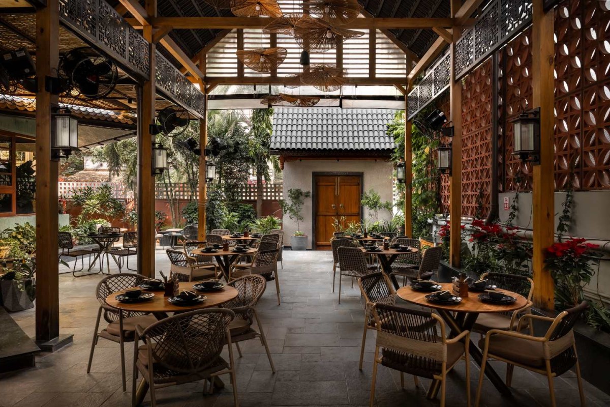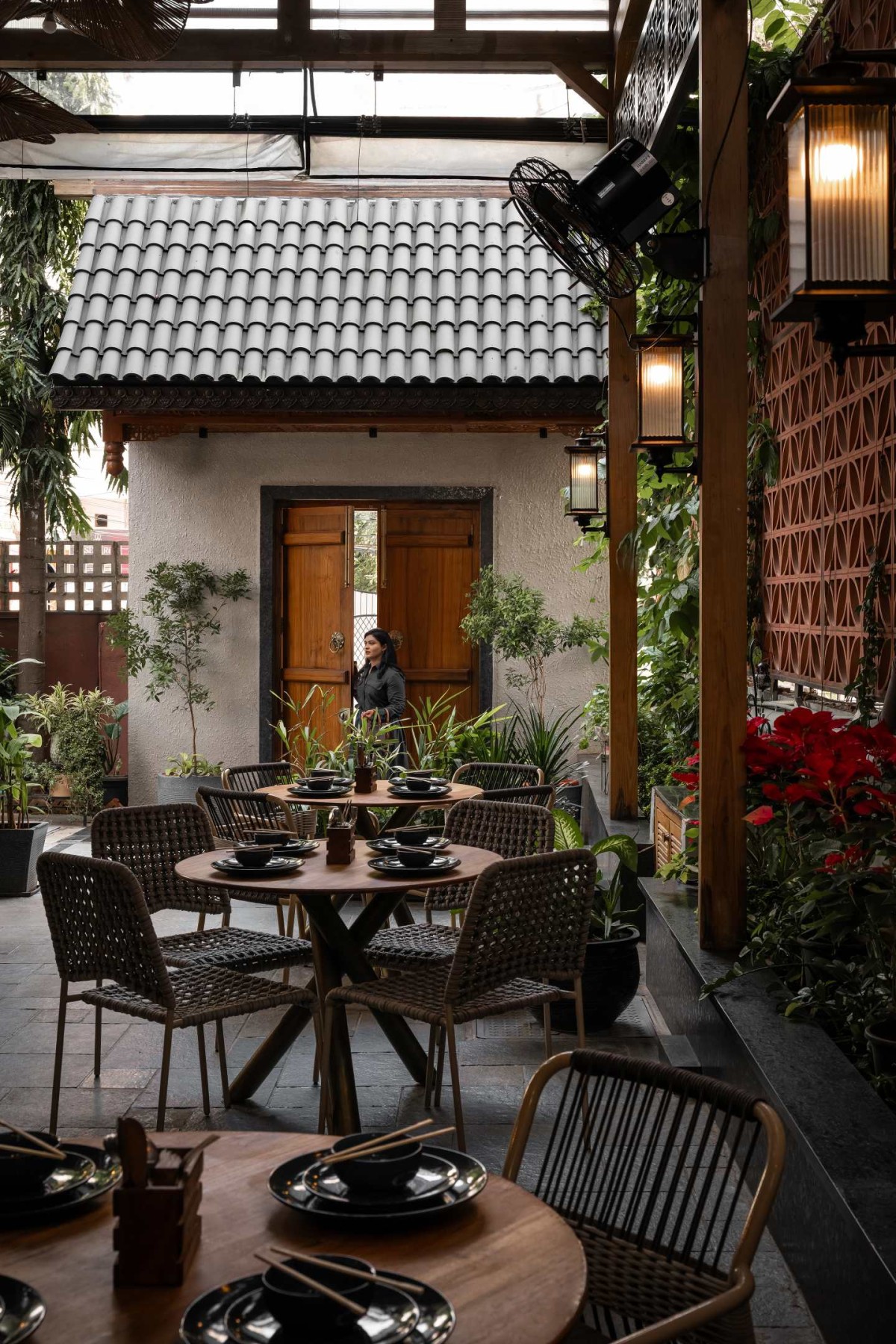 Materiality plays a significant role in shaping the sensorial identity of the café. The palette is restrained yet texturally rich—woven bamboo ceilings, rustic pine wood cladding, terracotta jaalis, rough-textured granite or limestone, and earthy texture paints. These surfaces, combined with soft lighting and abundant planting, evoke the warmth and craftsmanship associated with East-Asian vernacular architecture while remaining grounded in local construction practices. Local artisans were engaged for custom bamboo work, brick jaalis, and other handcrafted details, reinforcing the project’s commitment to regional craft and affordability.