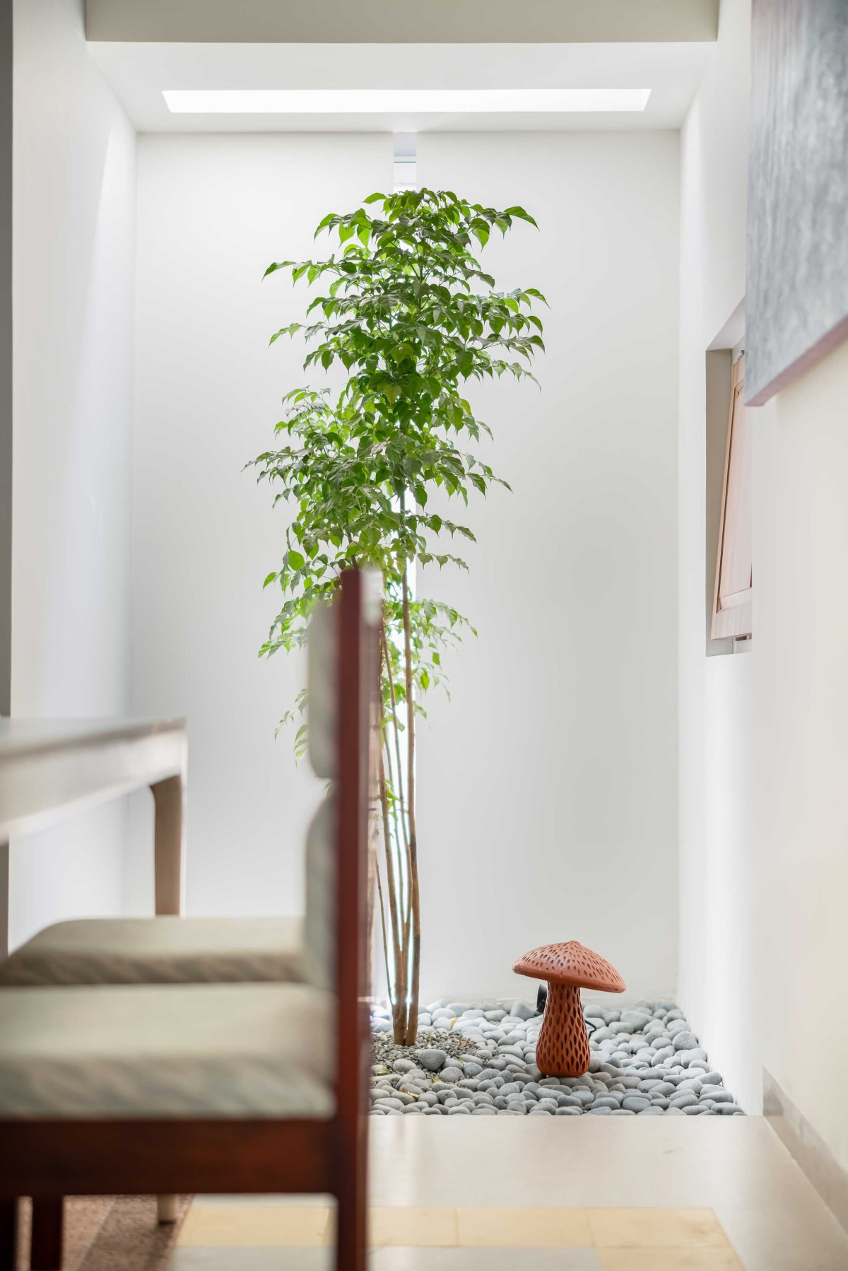 The design integrates green elements to strengthen the home’s connection with its natural surroundings. A small, landscaped garden at the entrance creates a welcoming ambiance and seamlessly blends with the veranda, fostering an indoor-outdoor living experience that is both relaxing and refreshing.