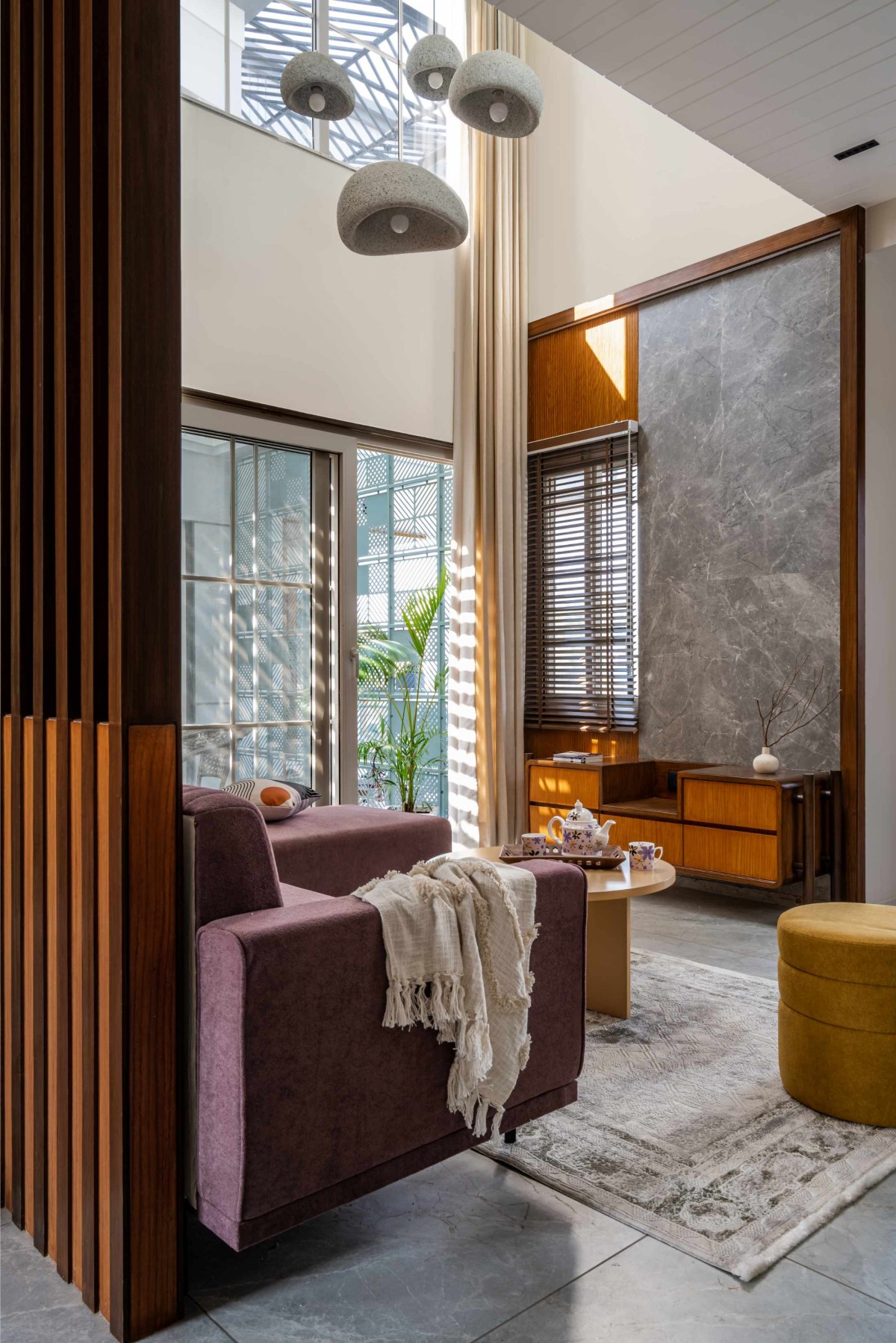 The entrance design exudes simplicity and elegance, with a welcoming aesthetic. As one enters the drawing room, the eye is drawn to a wooden partition and mustard yellow fluted paneling. Wooden partitions separate the kitchen and drawing room, while wooden fins create openness between the two spaces.