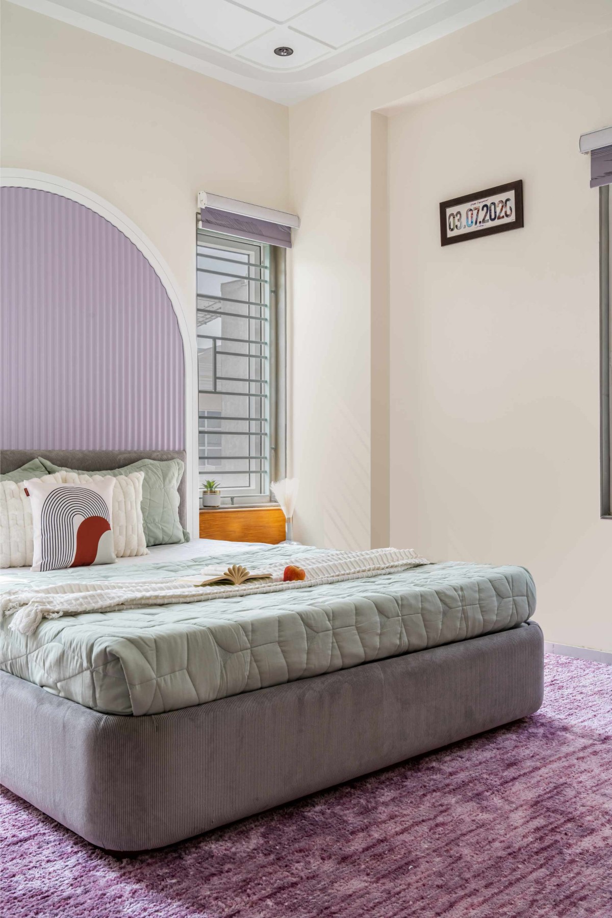 The parents’ bedroom exudes a seamless blend of modern luxury and simplicity. Beige walls and floral wallpaper in arched frames create an elegant and peaceful look, while the pastel yellow bedback establishes a calming atmosphere. A small seating area by the window provides a direct view of outdoor activities.