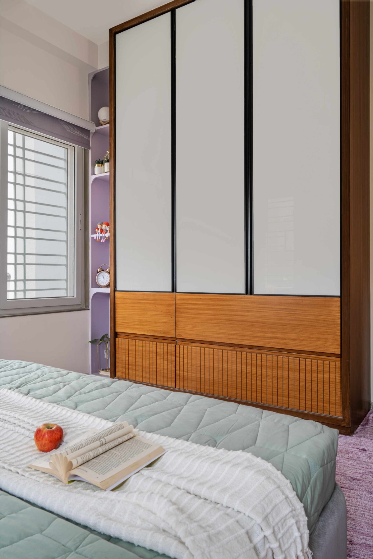 The son’s bedroom stands out with minimalist color choices. This approach enhances a visual and functional space with attention to detail. The material palette is a soothing blend of neutral tones and wood.