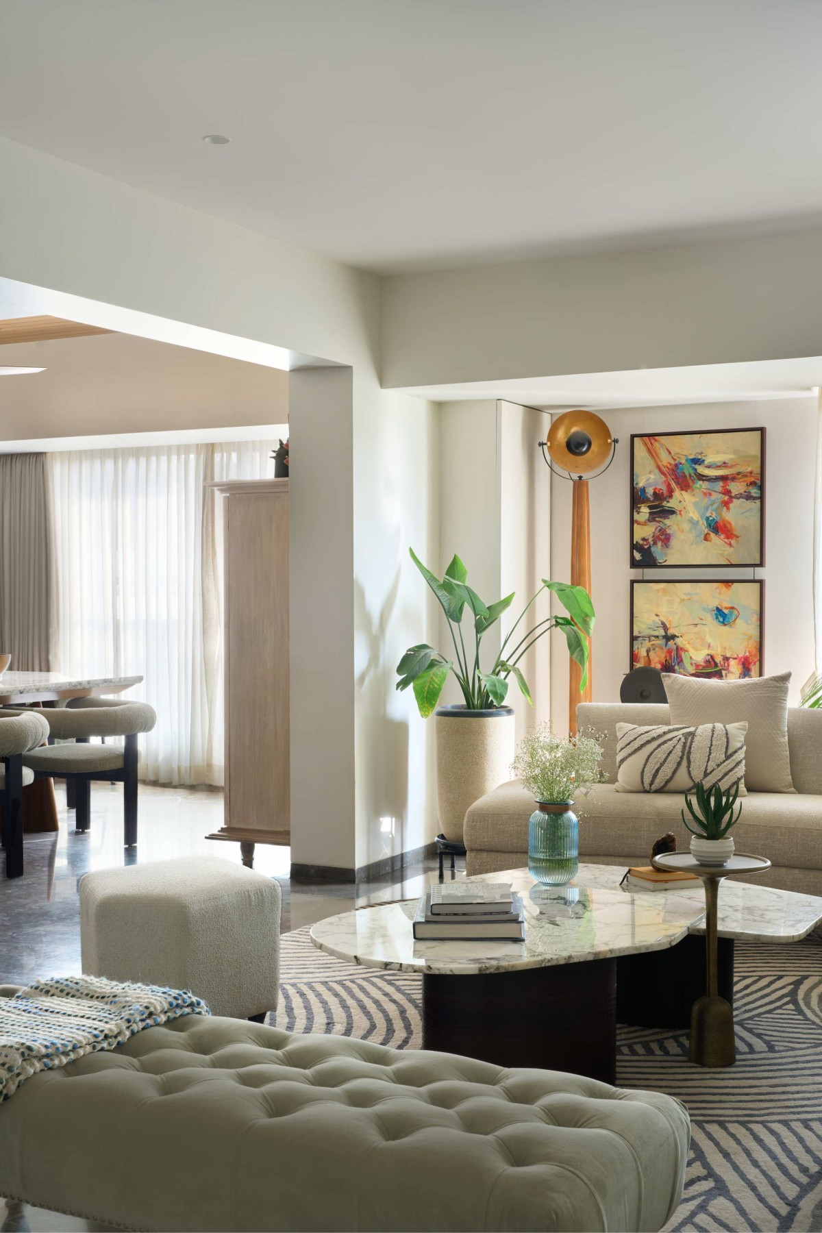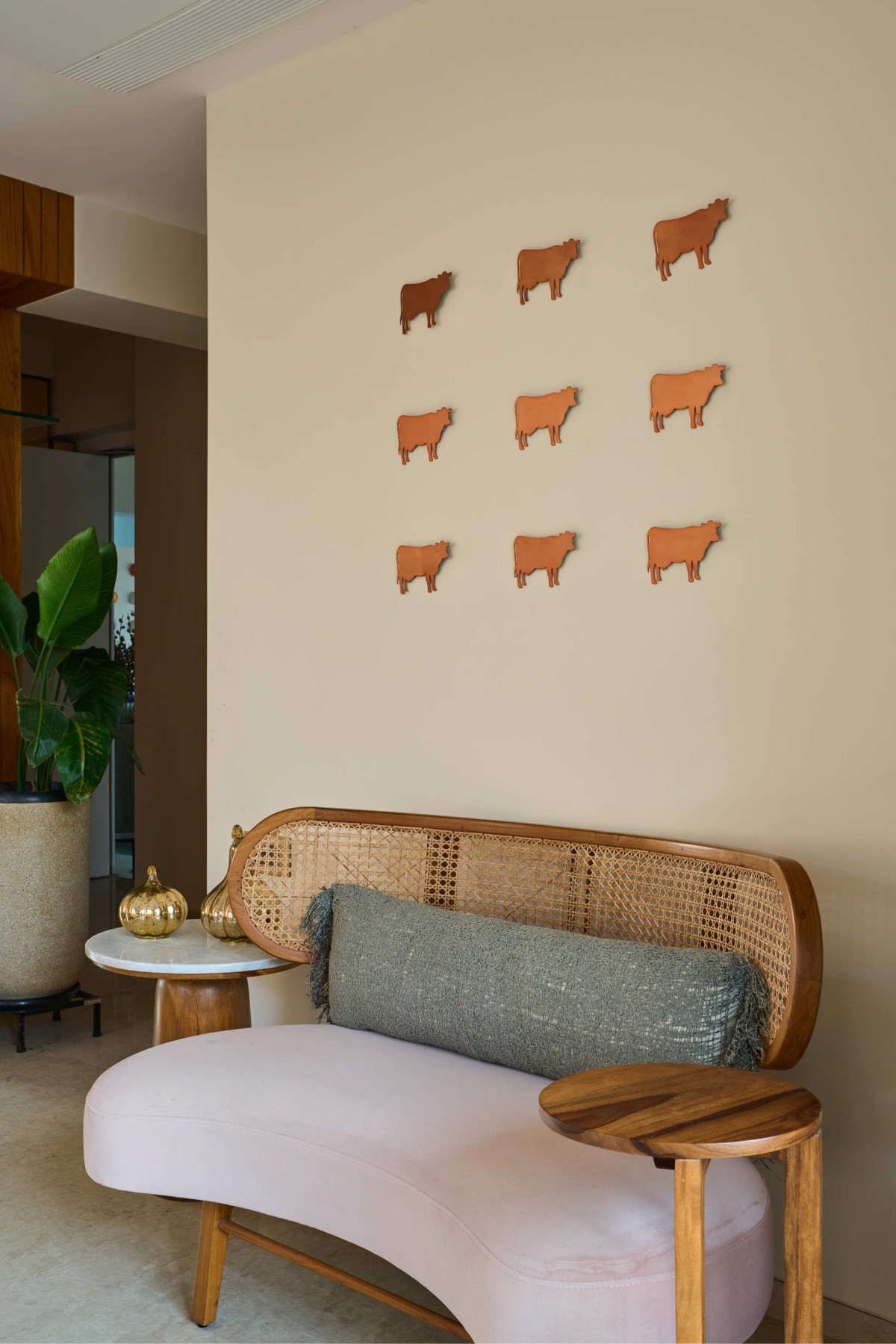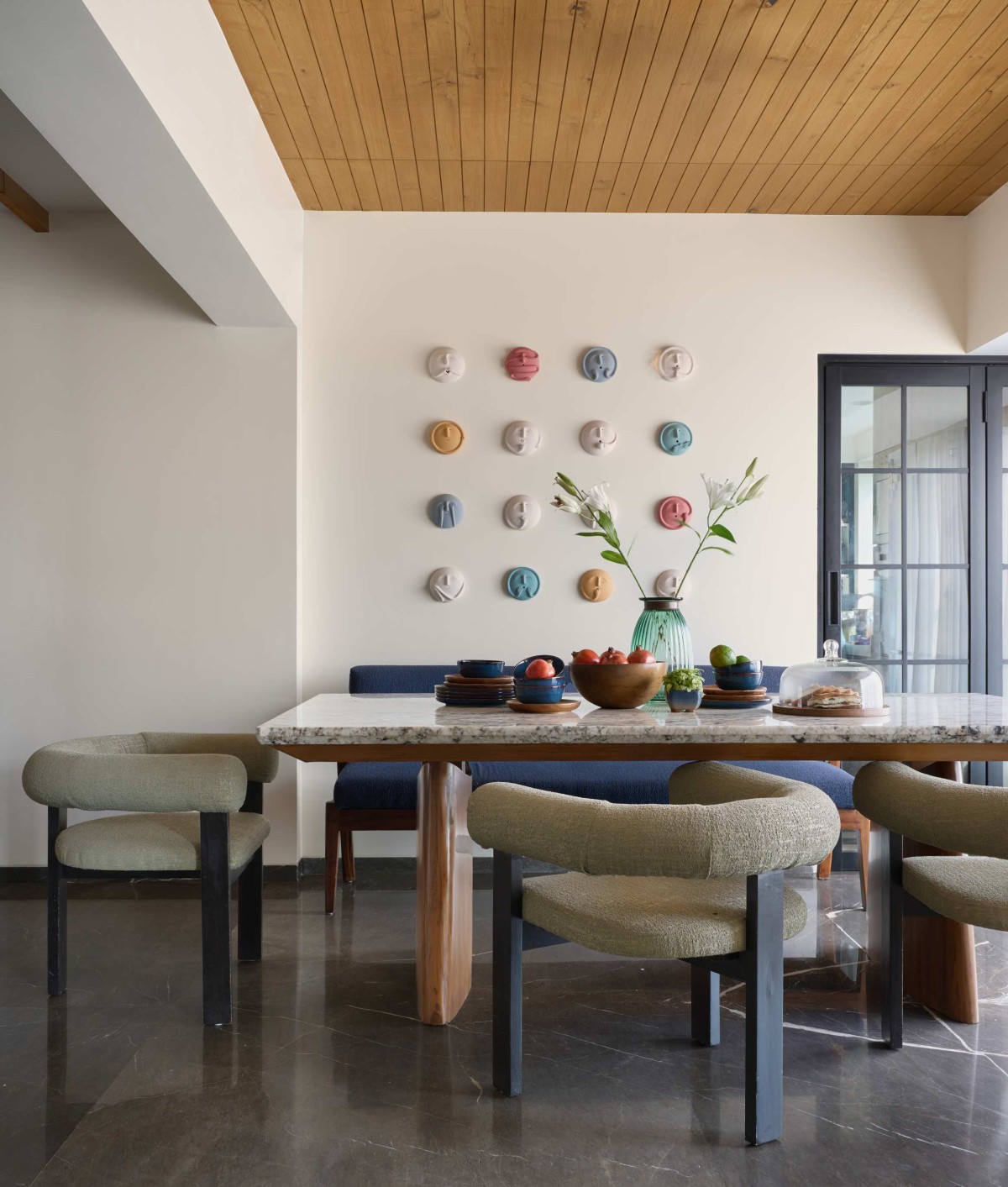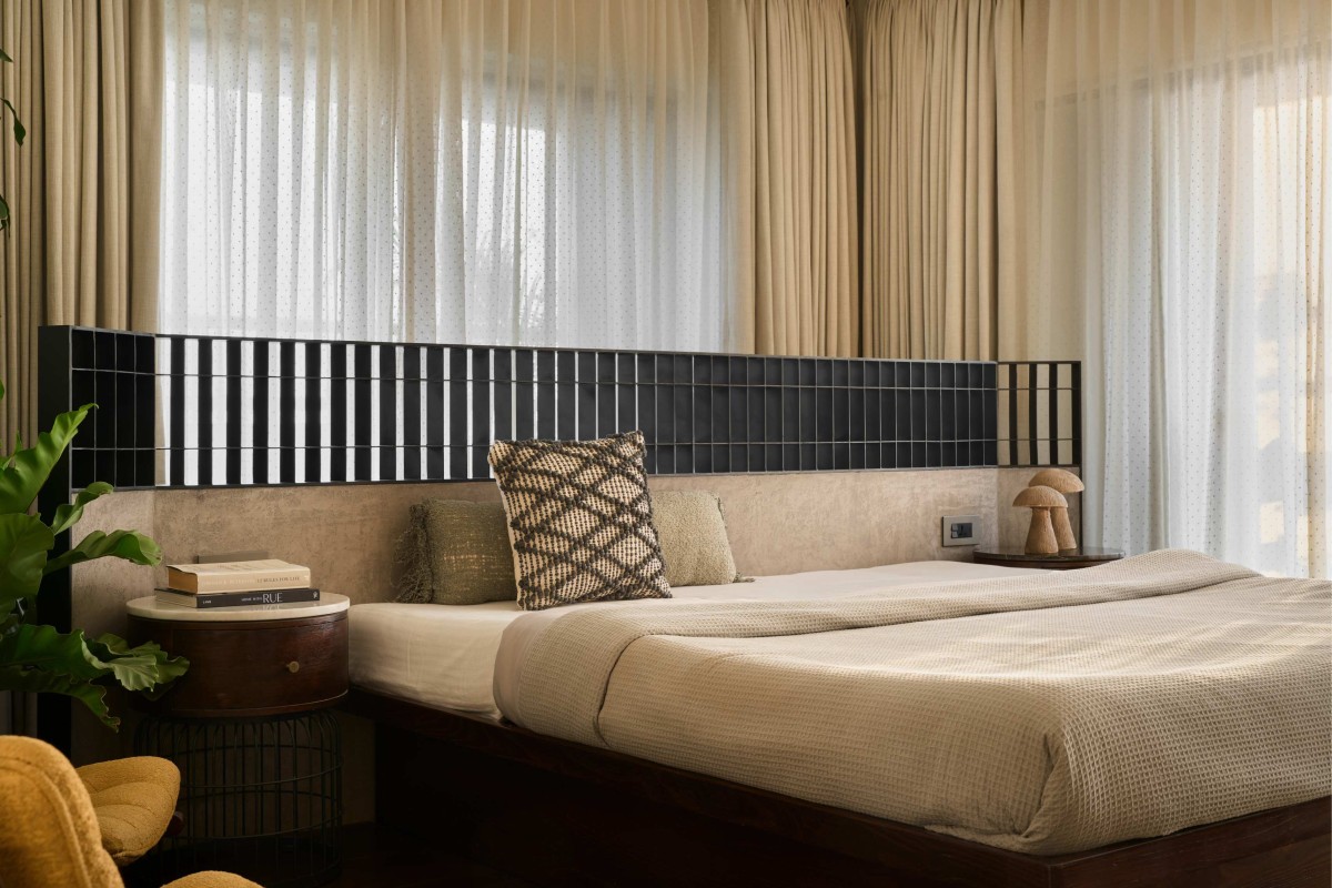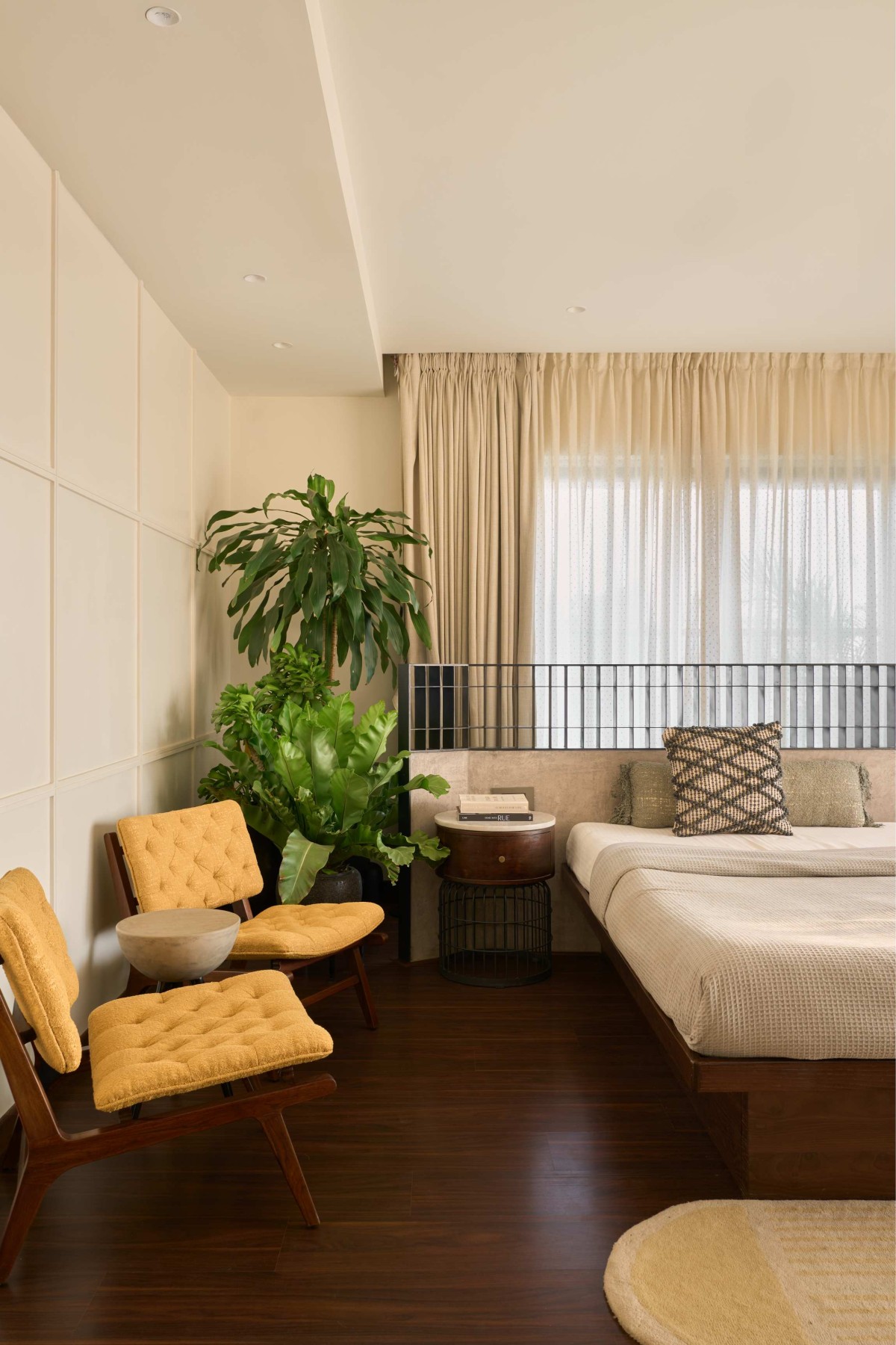 The project’s evolution was deeply collaborative — both with the clients and other creative studios. Furniture pieces from Thumbimpressions (Surat) and ORI, discovered at RAW Collaborative (Vadodara), introduced unique artisanal character and industrial nuances to the space. Art and accessories were chosen to punctuate the calmness with personality.