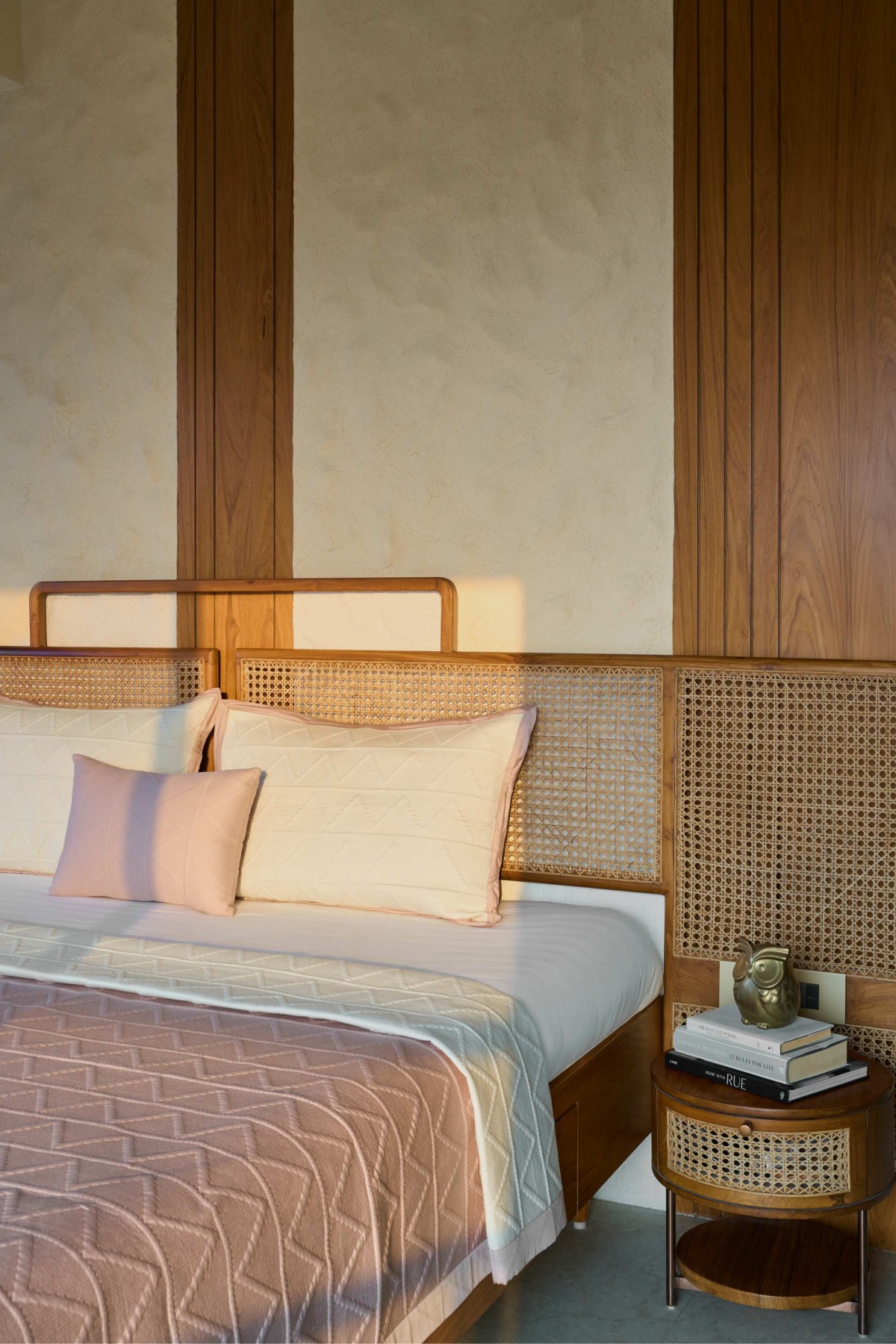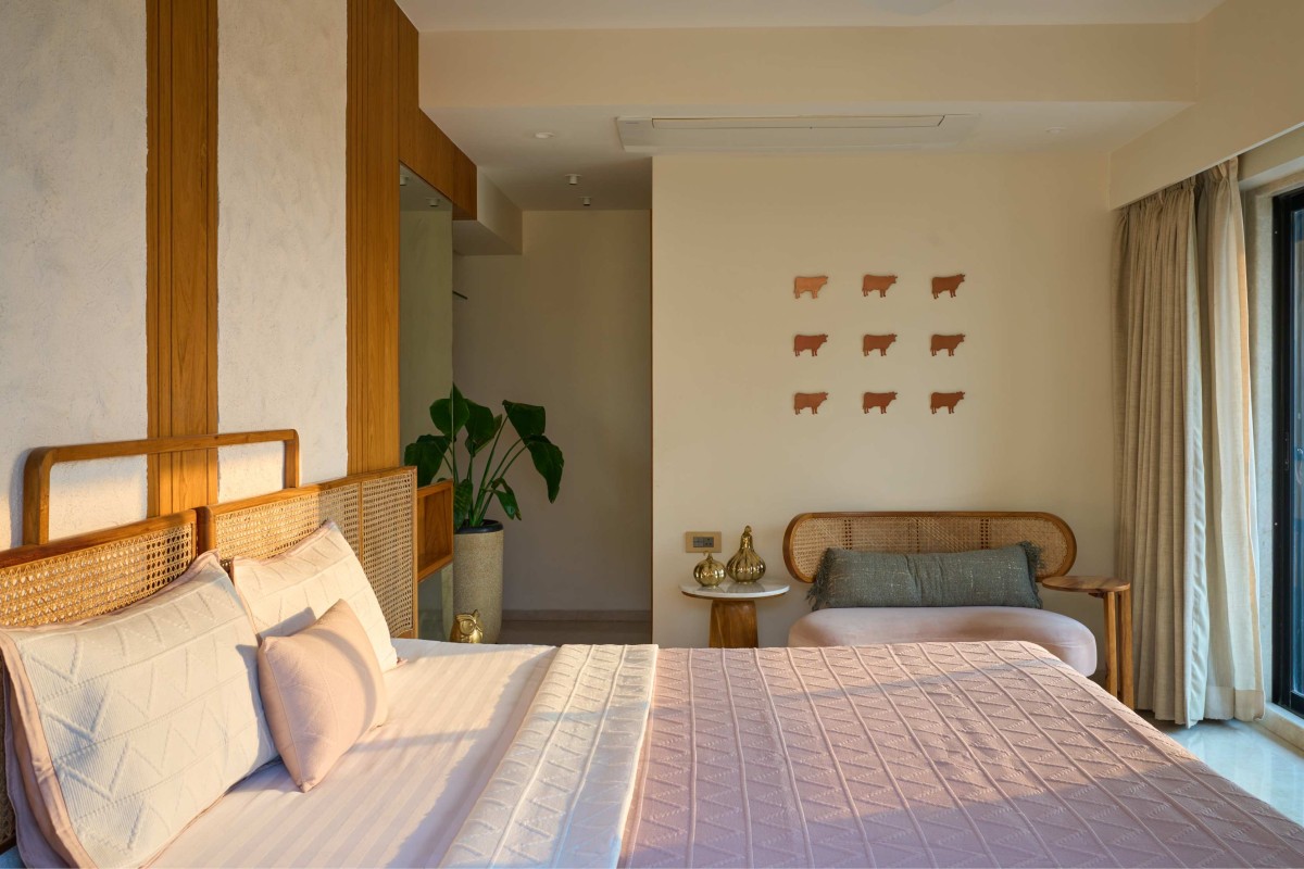 The parents' bedroom exudes a chic, tranquil ambiance, featuring stony textures complemented by cane elements on the bed and furniture. The wardrobes have a subtle rose gold tint that adds warmth to the space.