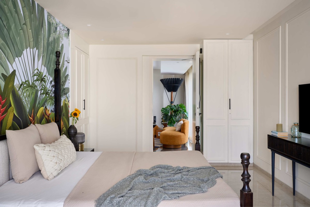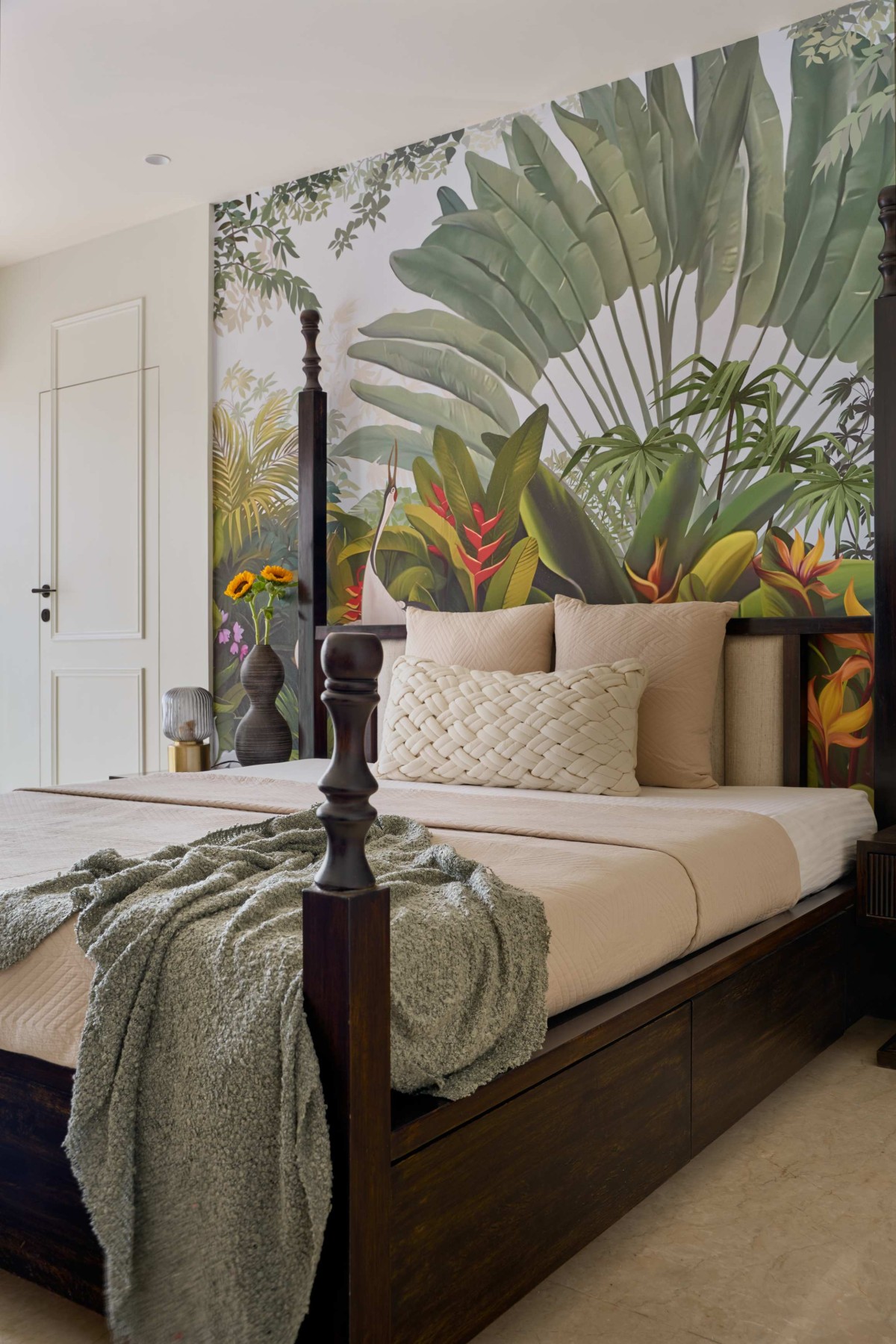 The guest bedroom is a cheerful space, doubling as a retreat and work area. Its loud, playful wallpaper contrasts the rest of the home, creating a lively yet comfortable atmosphere, with elaborate bed details and a large couch for lounging.