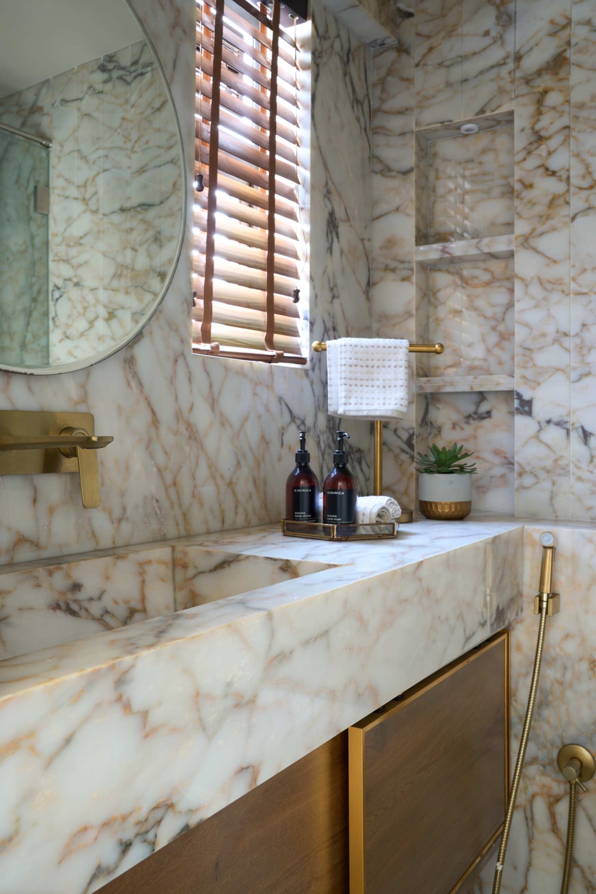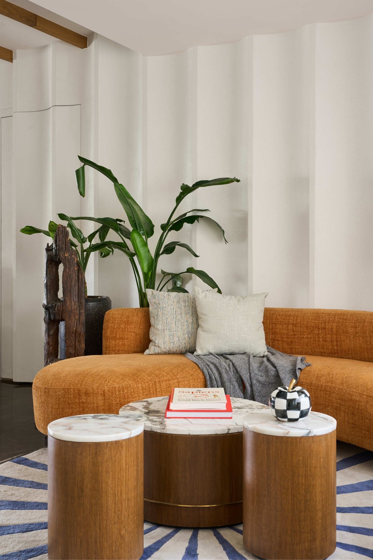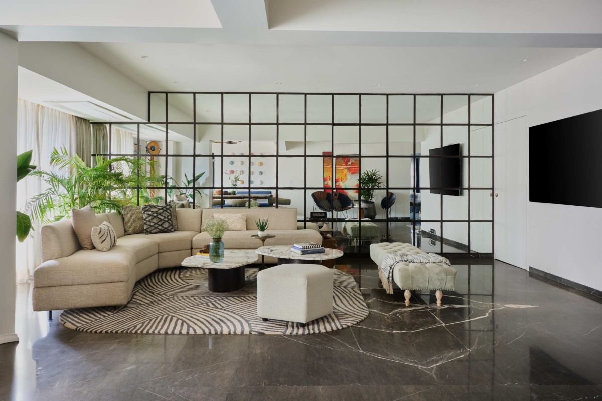 A neutral palette forms the base — soft beiges and greys enlivened by art, upholstery, and accent details. The boldest move, however, was the dark grey marble flooring — a dramatic yet grounding choice that elevates every other element. Initially met with hesitation, the clients embraced it wholeheartedly, and it became one of the defining features of the home.