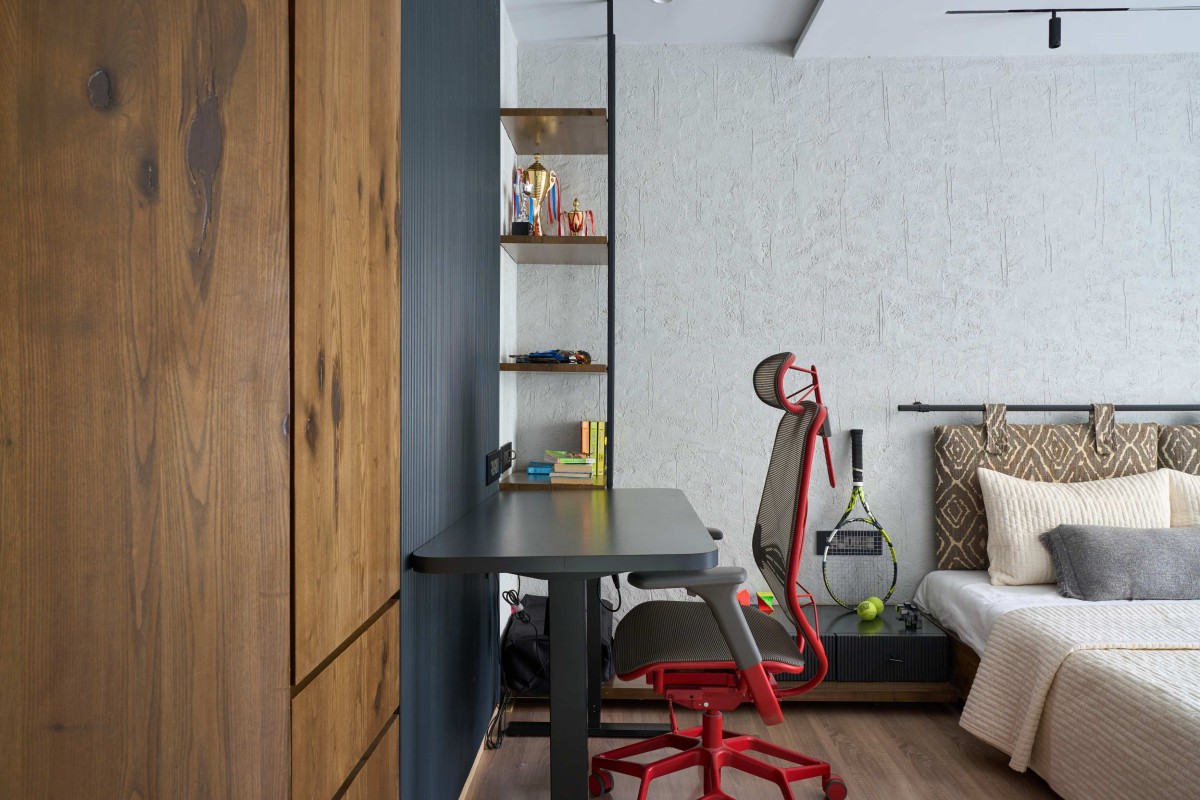 The son’s bedroom embraces shades of grey, with textures that reflect his personality. His walk-in wardrobe, featuring industrial elements, is discreetly closed off, maintaining privacy and a sense of order.