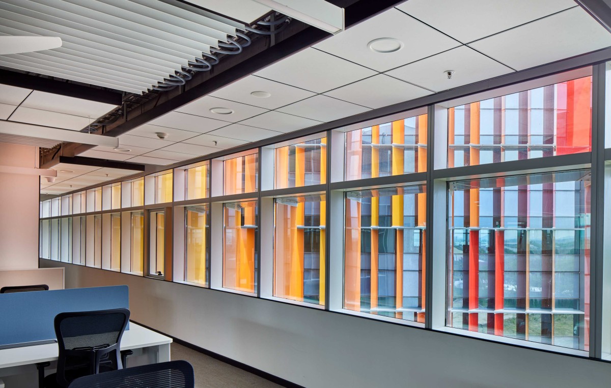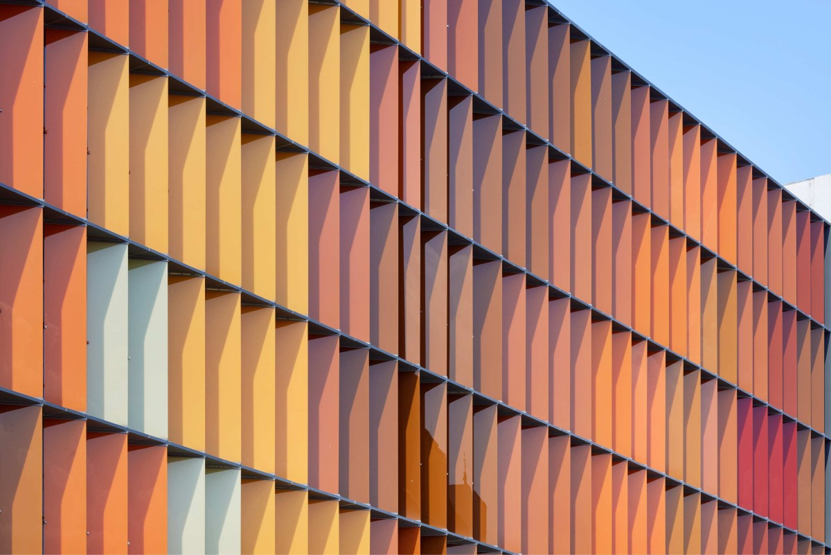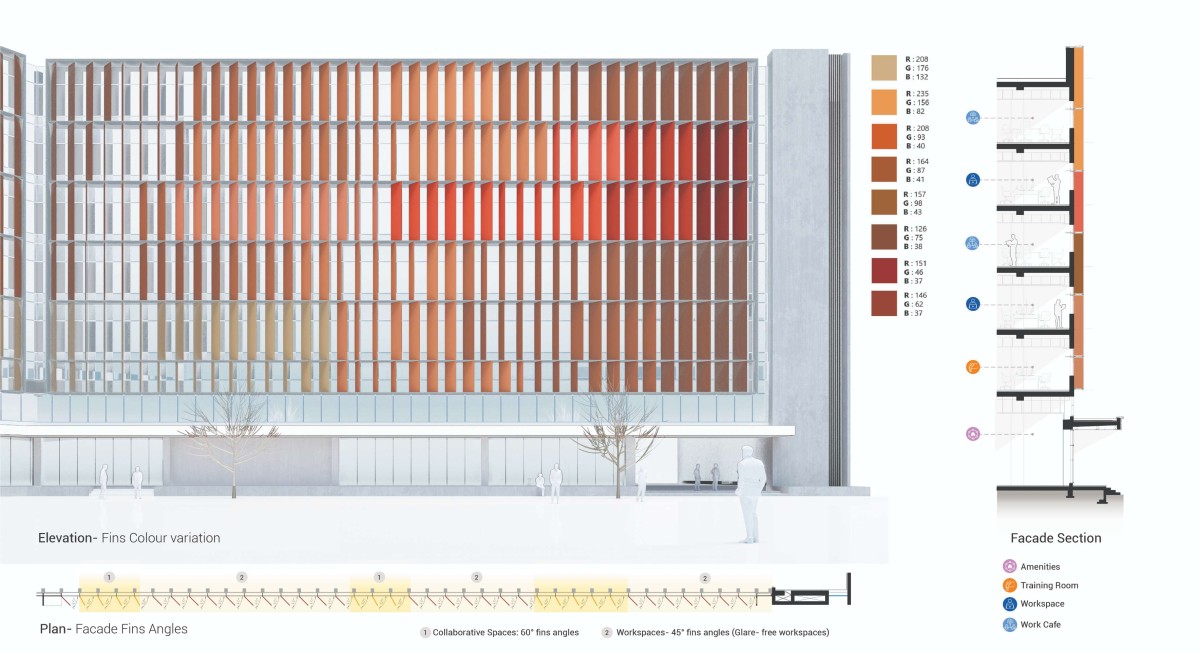 Vertical fins are strategically oriented at varying angles along the entire length of the facades to regulate ingress of light. The base hue for the fins is orange, and earthy tones are added to develop a gradient. The design is inspired by the seven swaras (Indian classical music notes) and adds a sense of rhythm and visual dynamism to the building exterior.
