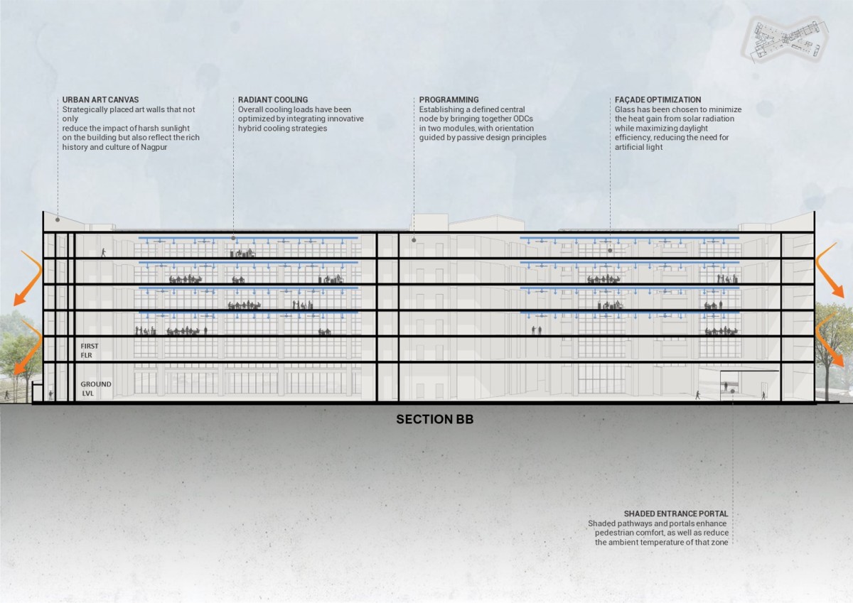 One of the key design strategies employed was the integration of passive cooling techniques tailored to Nagpur's climate. Borrowing from traditional architectural principles, the campus features natural ventilation systems and thermal mass elements that regulate indoor temperatures, reducing reliance on mechanical cooling.