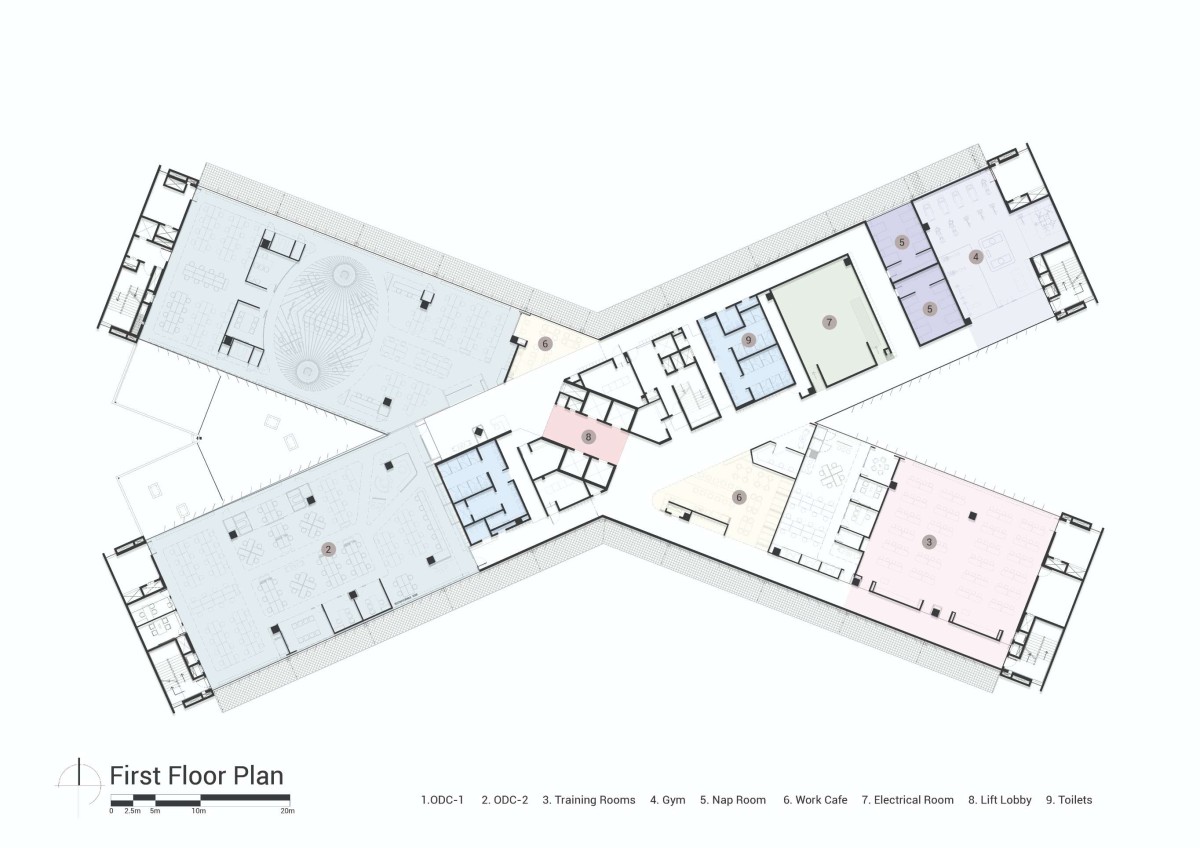 The building’s form and orientation played an integral role in achieving the numerous sustainability goals. It features a distinctive X-shaped plan, with each of the 100m long wings oriented at 22.5 degrees to the tropic of Cancer, and the central intersection forming the core. This intervention, long with limiting the depth of each floor plate to 18m, ensures that 90% of the workspaces receive ample daylight from both sides. The morphology also responds to programmatic requirements, establishing a central circulation node that brings together the Offshore Development Centres (ODC) located in the wings.