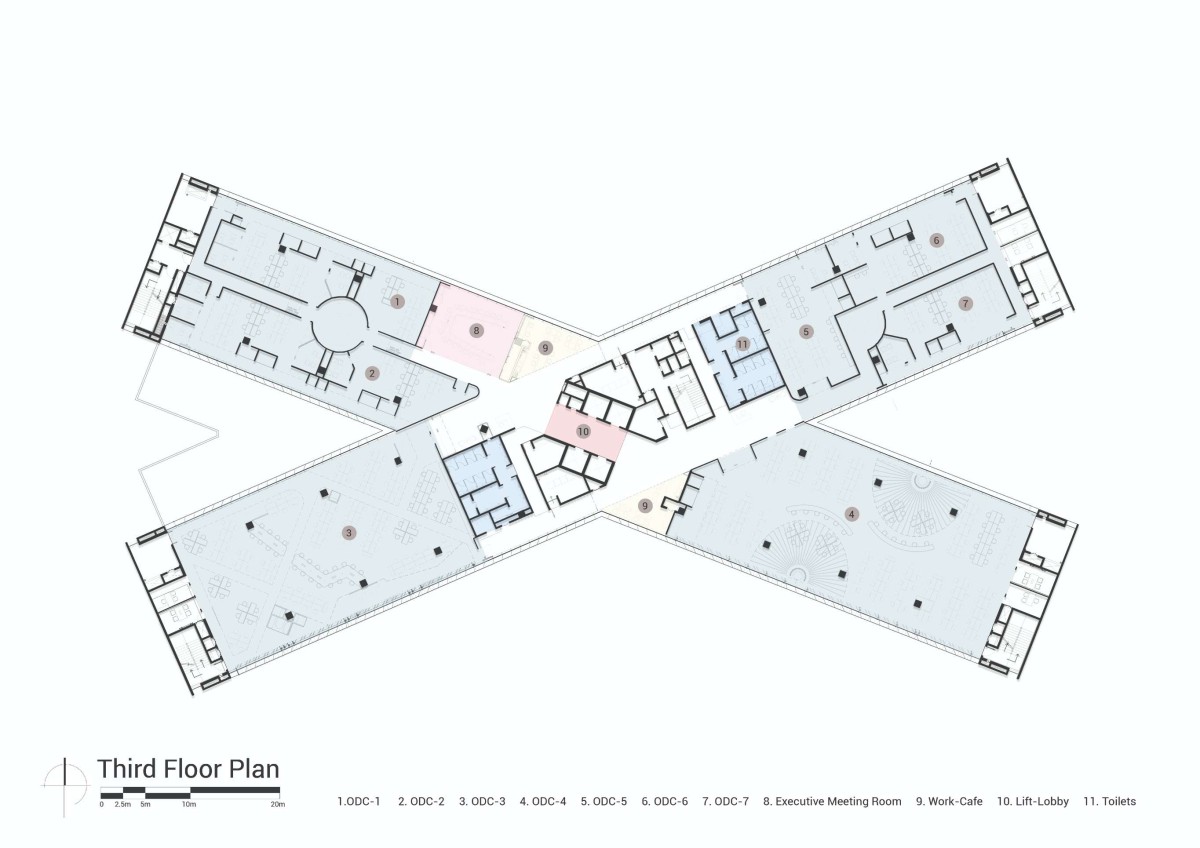 The Offshore Development Centres (ODC) are designed with high levels of efficiency. Roughly twenty percent of the area is dedicated to circulation cores, and eighty per cent reserved for workspaces. The diverse programme includes collaborative workstations, conference rooms, break-out areas, and office pods.