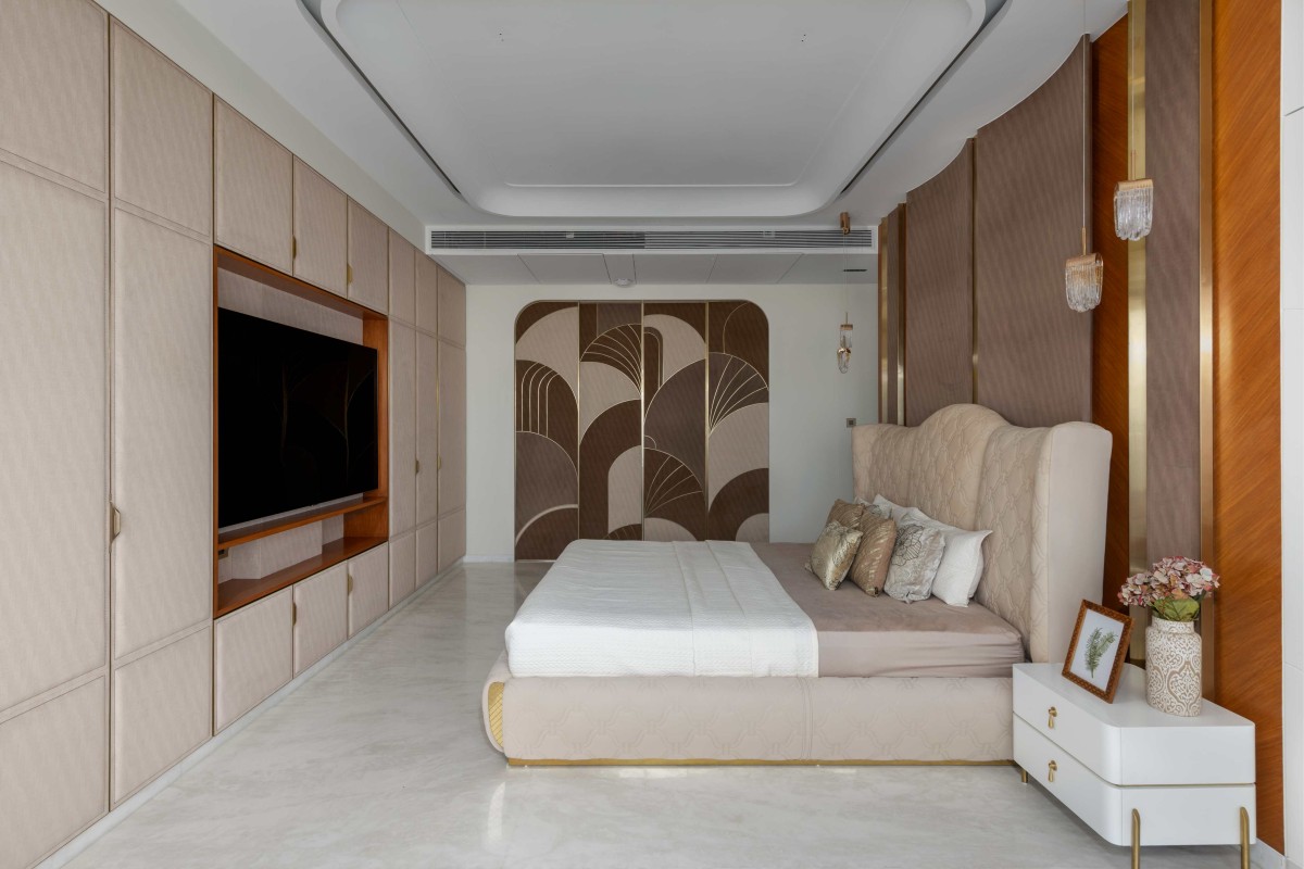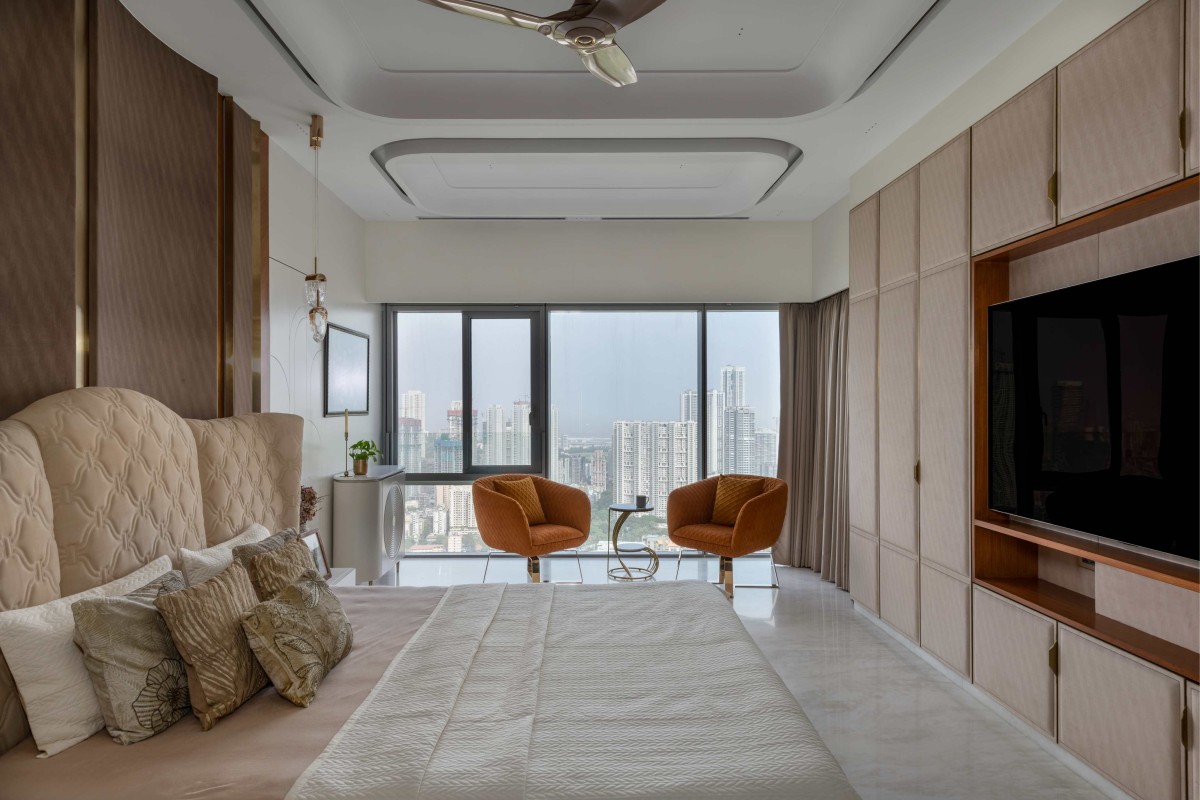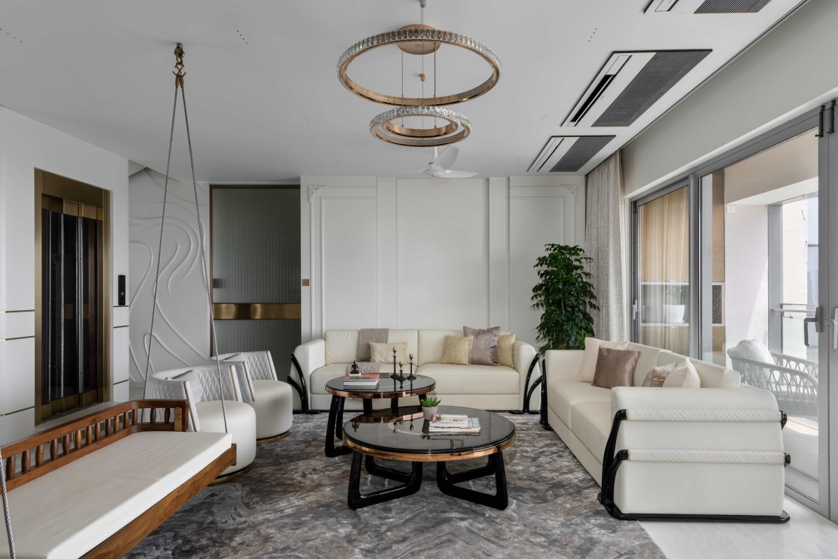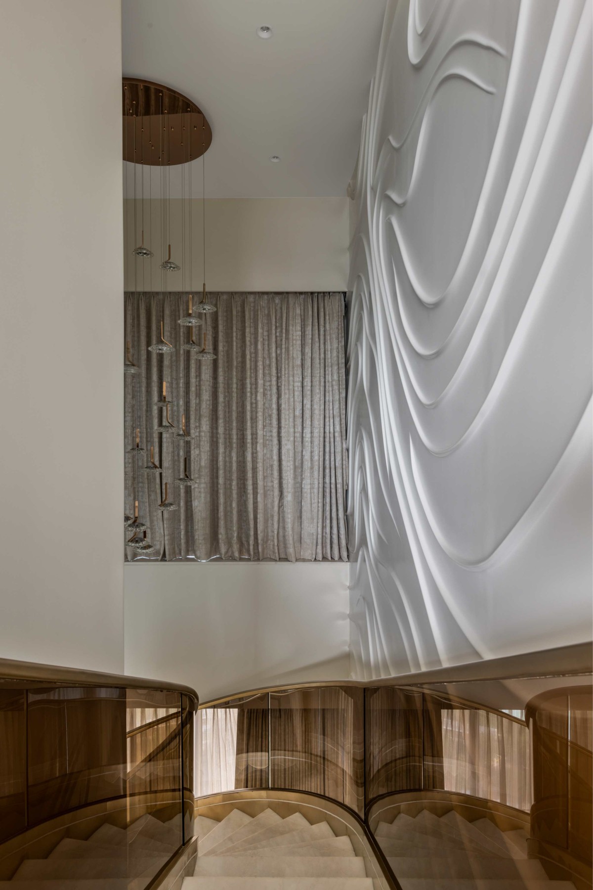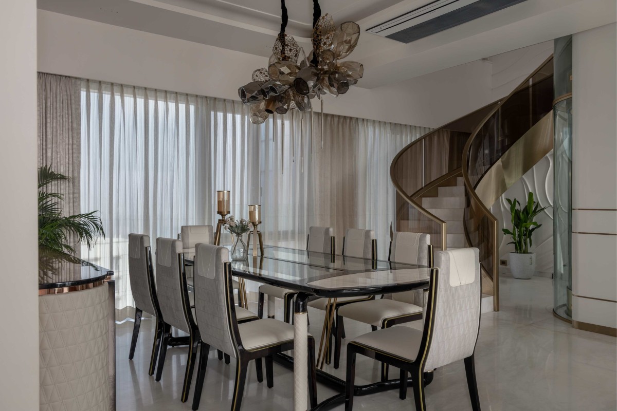 The jewel spiral staircase wrapped around a semi-capsule lift anchors the open floor plan. The spiral staircase is made in complete metal along with glass and marble finish to make it look seamless and be the statement of the space. Ombré glass railing, marble treads, and brushed brass handrail curve upward in a sweeping gesture. A double-height wall beside the staircase is clad in a fluid panel, its undulating surface evoking the Arabian Sea. The ascent leads to the informal living area, dressed in warm beiges and taupes, where curved ceilings and layered lighting create a cocoon of quietude against the city’s skyline. A strategically placed perspective artwork in the space lends depth to the space.