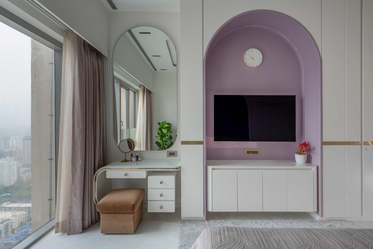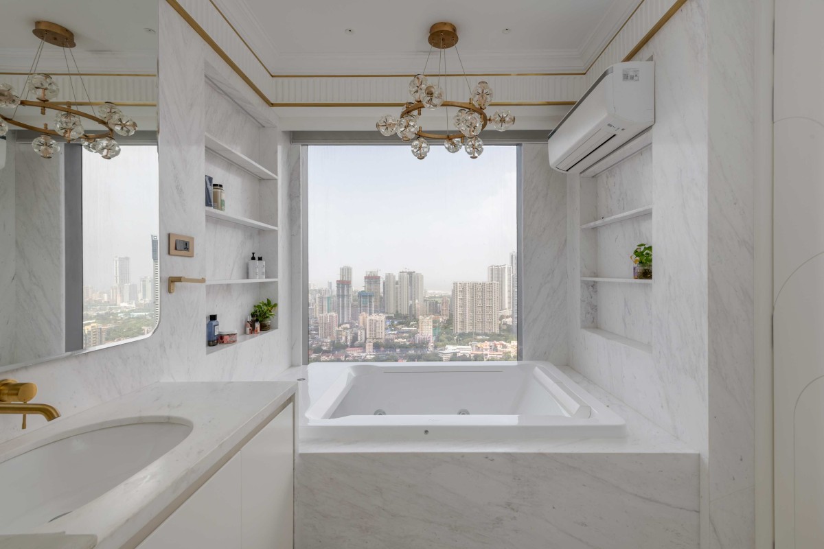 All bedrooms in the home are equipped with walk-in wardrobes, engulfing cityscape views, automated sensor-based temperature and curtain settings, becoming private sanctuaries. The son’s room celebrates his toy gun collection with a custom display wall supported by a characteristic climbing wall for play. The daughter’s room reflects her transition into young adulthood in soft lilac, with a dedicated dresser and study. The master suite crowns the home with understated luxury. Shades of brown, beige, and champagne gold set the palette, with bespoke detailing and expansive views. Dual walk-in wardrobes for him and her unfold as personalized retreats which have been finished in real leather, an electrical controlled self watch winder, a dehumidifier and ozonizer fitted within the walkin wardrobes. The adjoining bathroom, finished in stunning Greek White Thassos marble, completes the suite as a spa-like escape. The bathtub overlooks a seascape expanse, transforming the space into “a falcon’s nest in the clouds”. The bathroom balances indulgence with sustainability, with smart WCs and water-efficient fittings that conserve resources, while natural light, passive ventilation, and a water recovery system for the jacuzzi further anchor the design in eco-consciousness. This space was recently conferred with the GROHE Bath & Design Award 2025, held in collaboration with Architectural Digest India.
