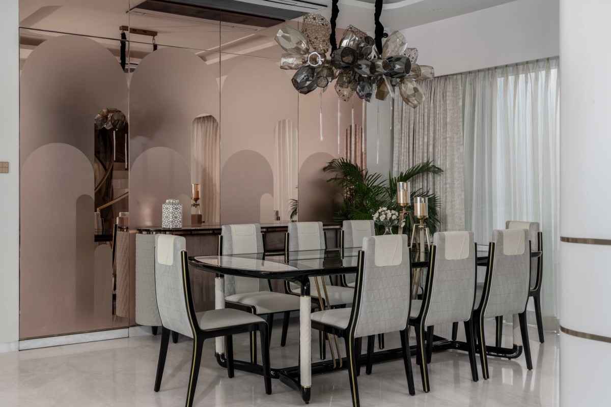 At the end of the corridor, the formal living and dining area is revealed in a luminous palette of whites, taupes, hints of gold, and sharp black accents. The black exoskeleton of the Versace sofas, nested centre tables, and dining chairs recall Mumbai’s Art Deco legacy. Subtle brass detailing weaves throughout: on door trims, the elevator frame, furniture edges, and chandeliers, adding a gentle sheen. The dining area’s focal wall, panelled in rose gold mirrors, conceals the powder room with arch-like patterns drawn over it.