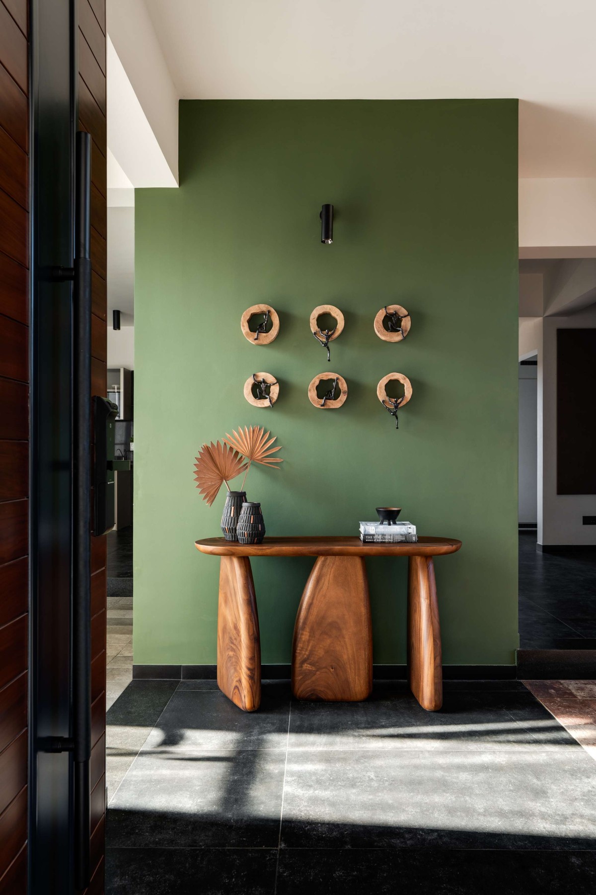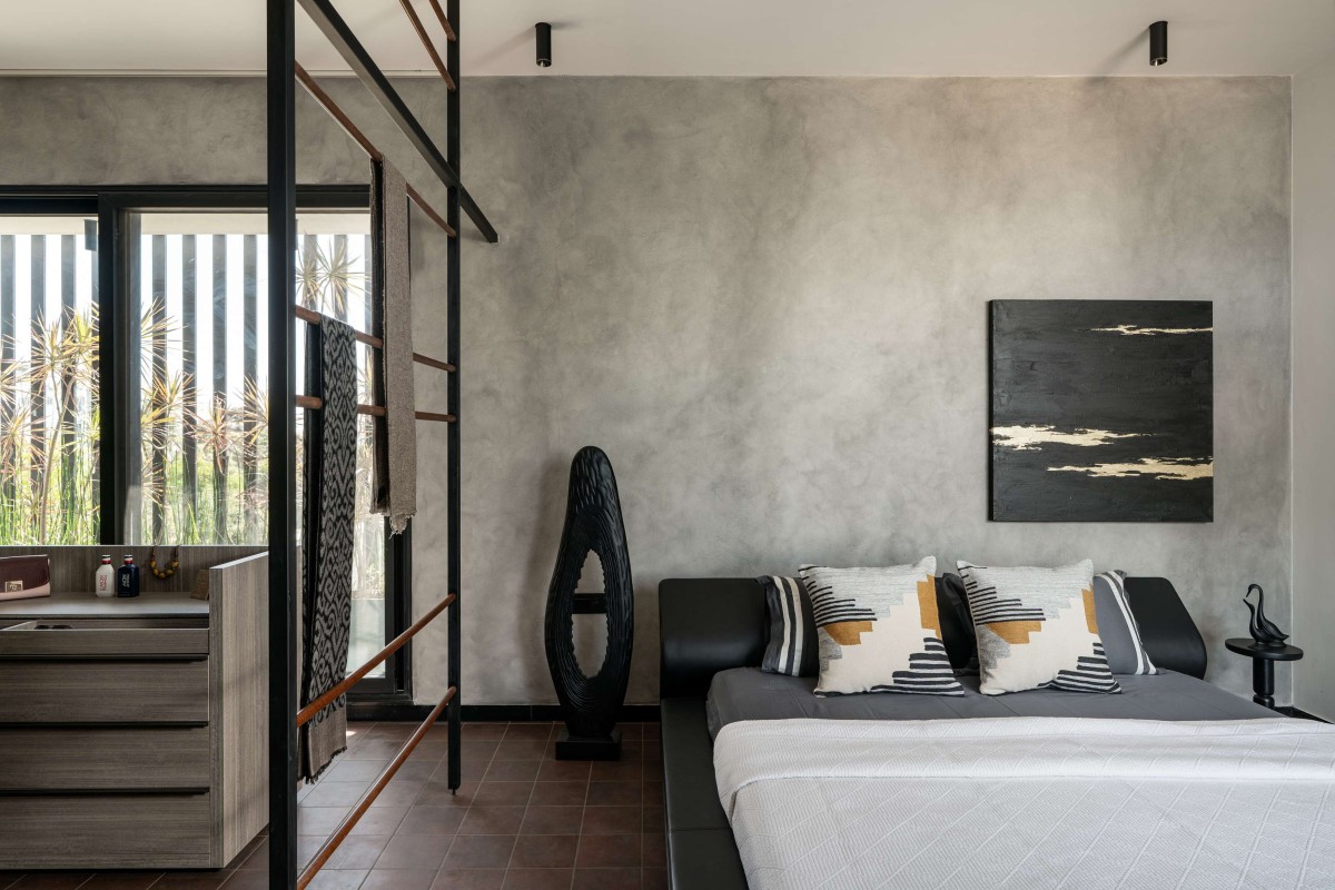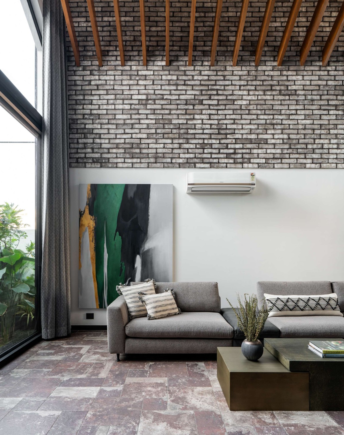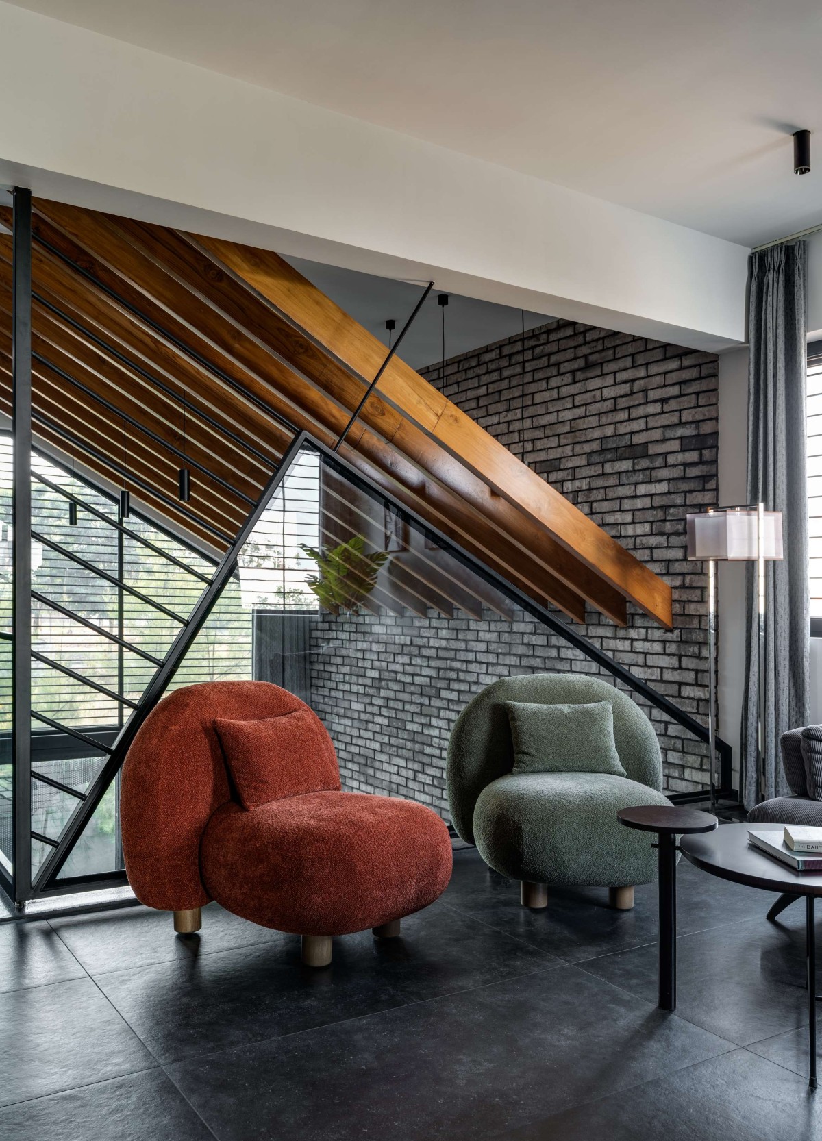 Inside, an olive-toned foyer leads to a double-height living area with exposed brick walls, wooden rafters, and a cantilevered staircase — all brought together with an eye for detail and craft. The use of natural textures adds depth and softness, creating a tranquil atmosphere.