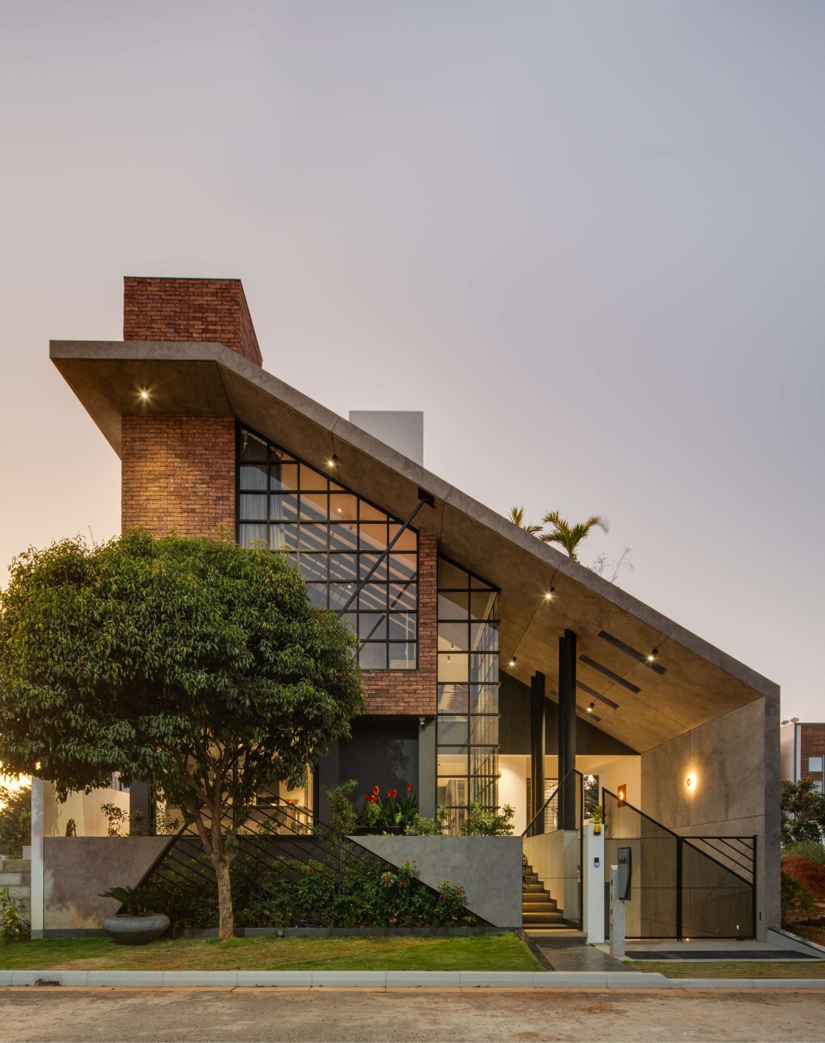Dusk light exterior view of Kodalli Happy Place by Ashwin Architects