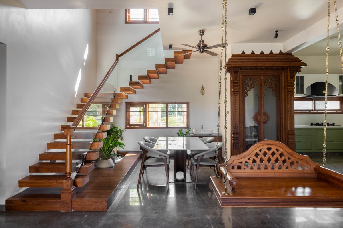 The living room is conceived as the heart of the home, where traditional aesthetics seamlessly blend with European design elements. Intricately carved natural wood elements—most prominently in the puja unit and the main entrance door—root the space in cultural depth. Soft daylight filters in through the skylight, creating ever-changing patterns of light and shadow that enliven the interiors throughout the day. A sculptural staircase with floating wooden treads adds a sense of fluid movement and continuity. The open kitchen integrates with the living and dining area, adding a sense of openness.