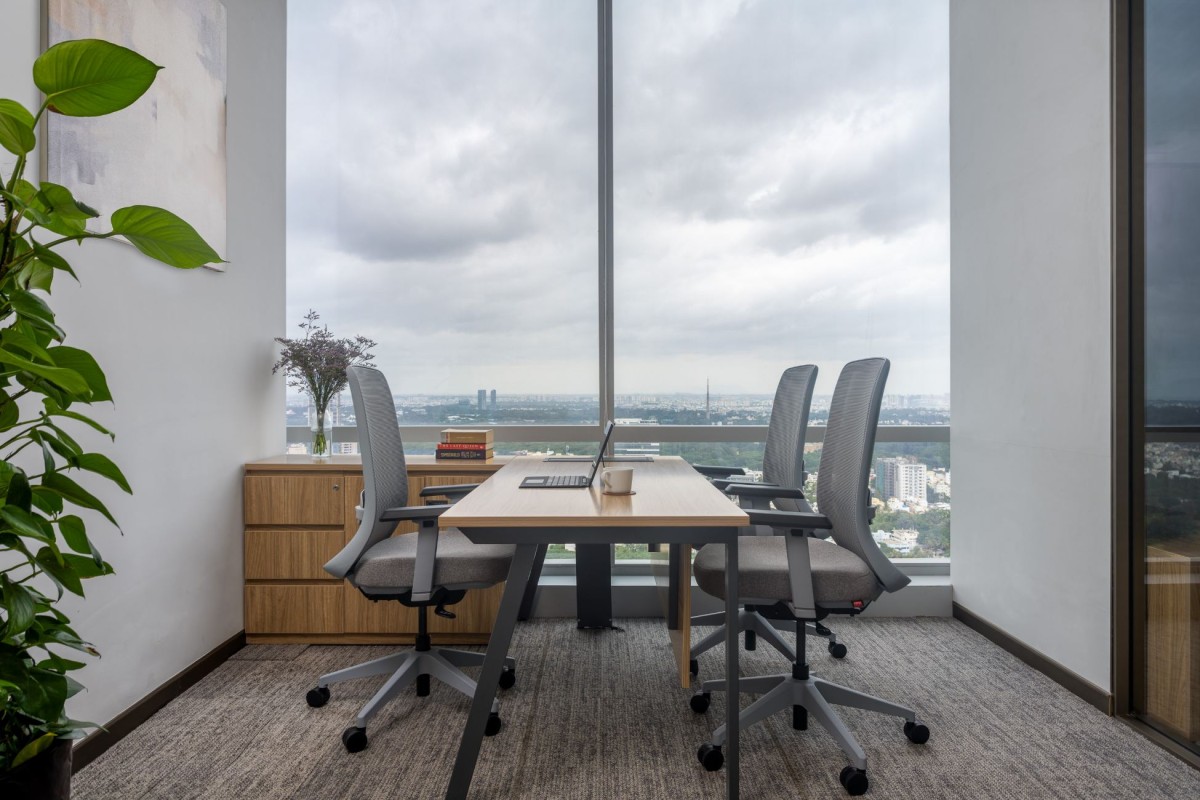 Tucked into a far corner past the design team of turnkey 5.0, a surreal artwork sets a tone of creativity and quiet escapism. This mood extends into the adjoining CXO cabin, where a contemporary work table and storage in rich veneer the room with a sense of refined authority. A transparent partition wall subtly defines the space, offering privacy without closing off natural light. Every element from the muted walls to the elegant storage solutions is intentionally restrained, offering clarity without coldness. This is where minimalism meets comfort, and functionality is wrapped in sophistication
