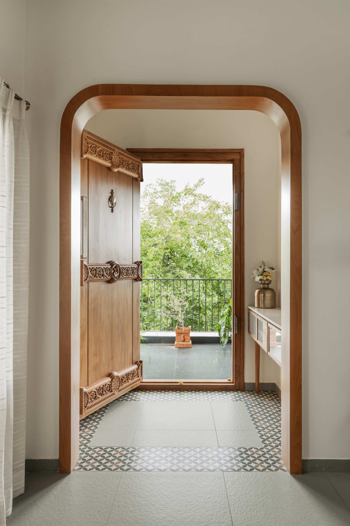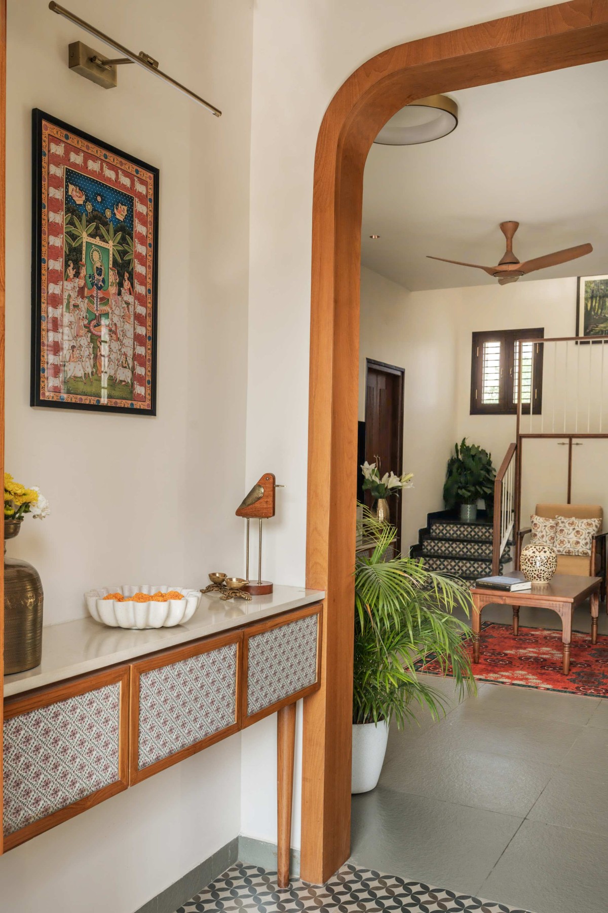 The foyer also offers a subtle glimpse into the living room while still preserving a sense of privacy.