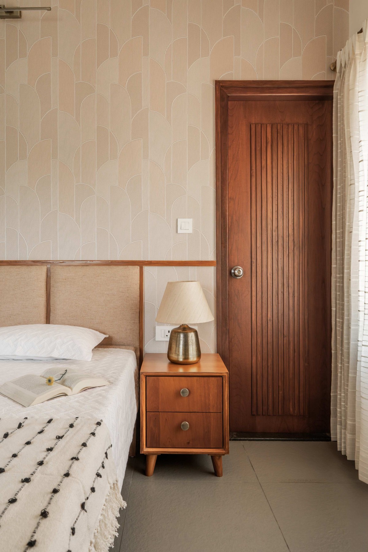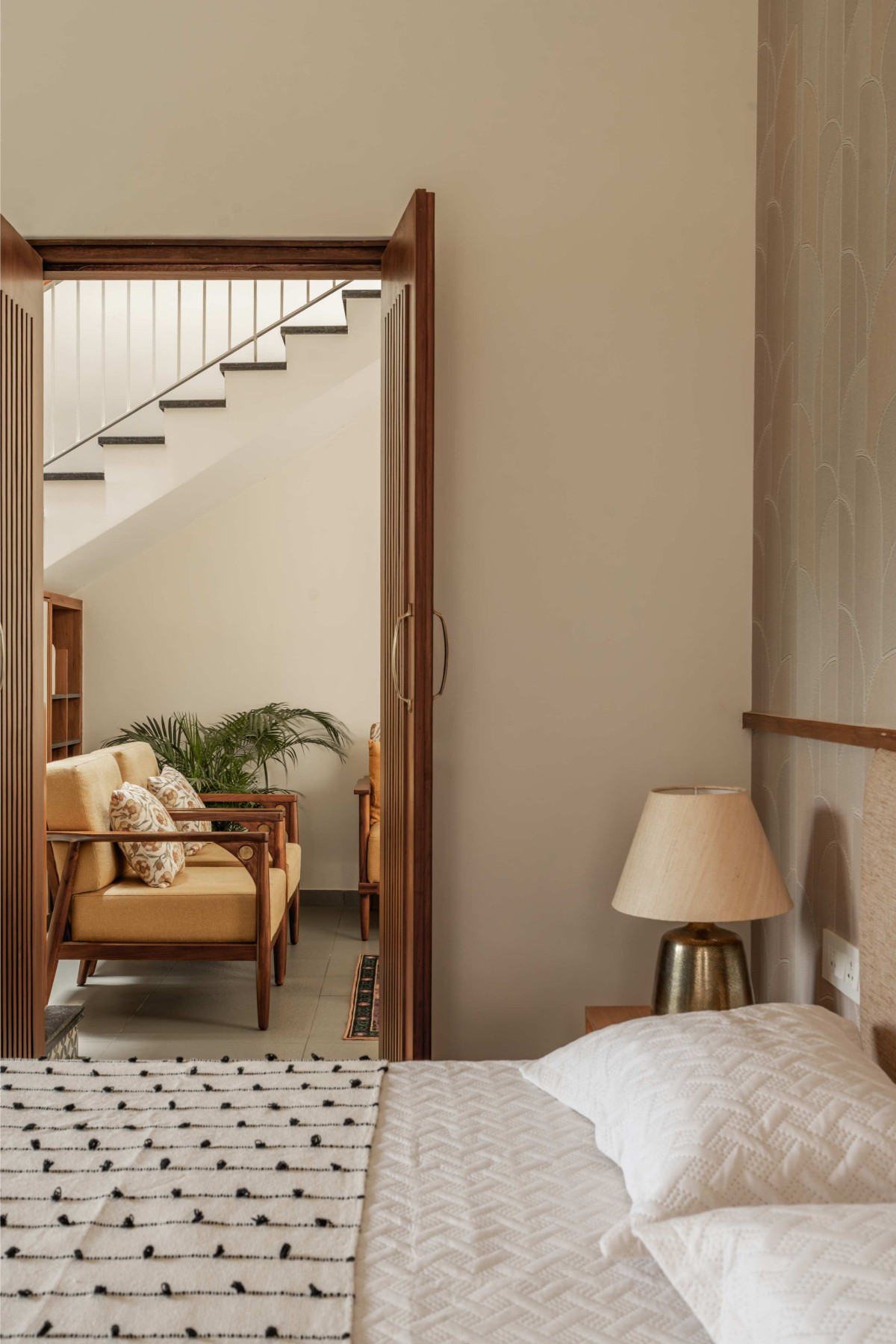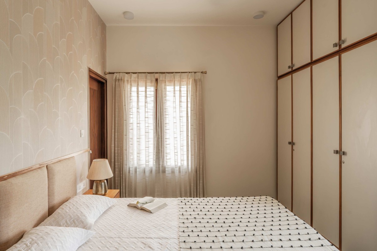The master bedroom features a simple yet striking palette of beiges and browns, seamlessly complementing the warm aesthetic of the space. Custom-designed nightstands and solid wood doors enhance the room’s understated elegance.