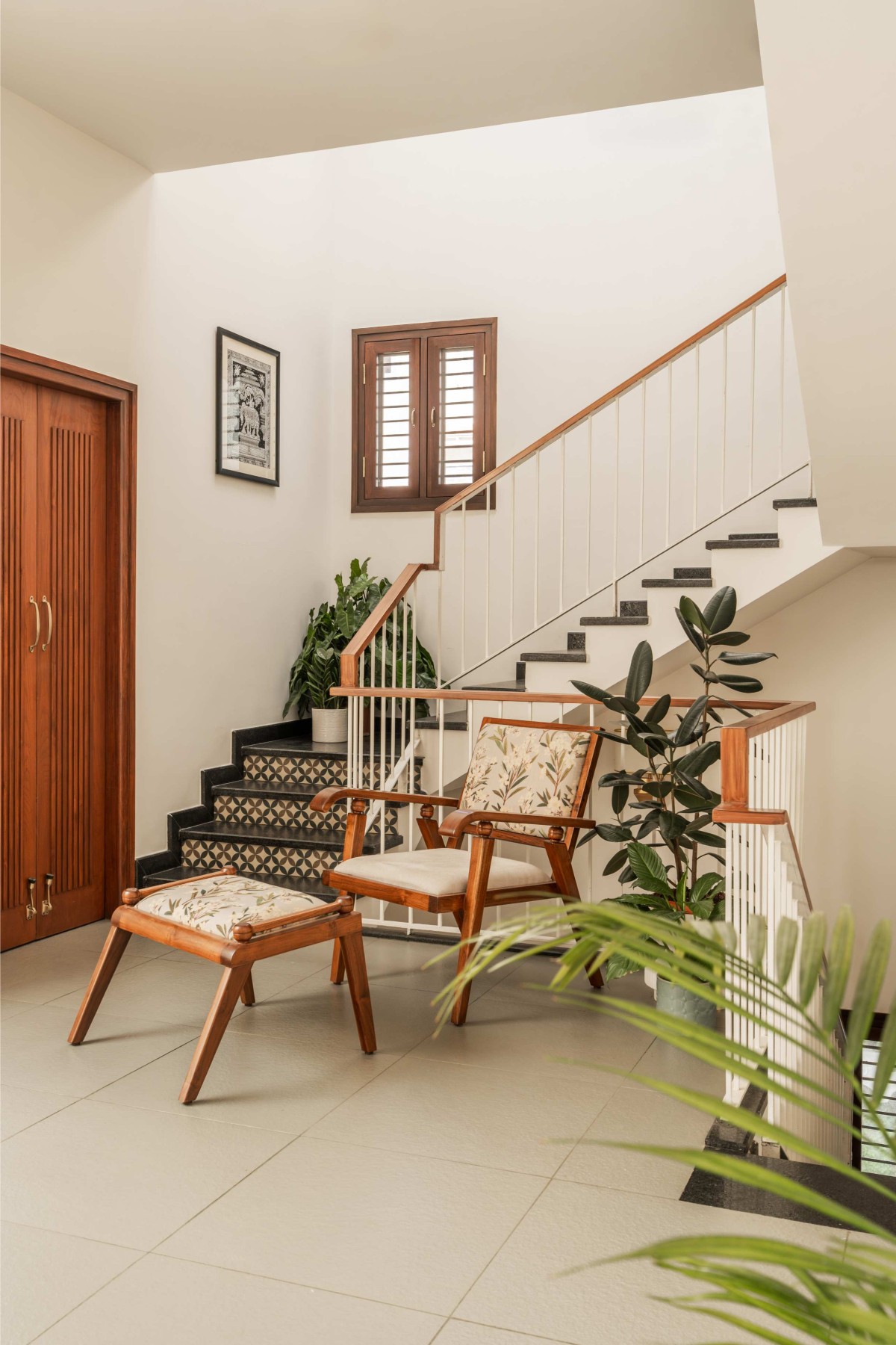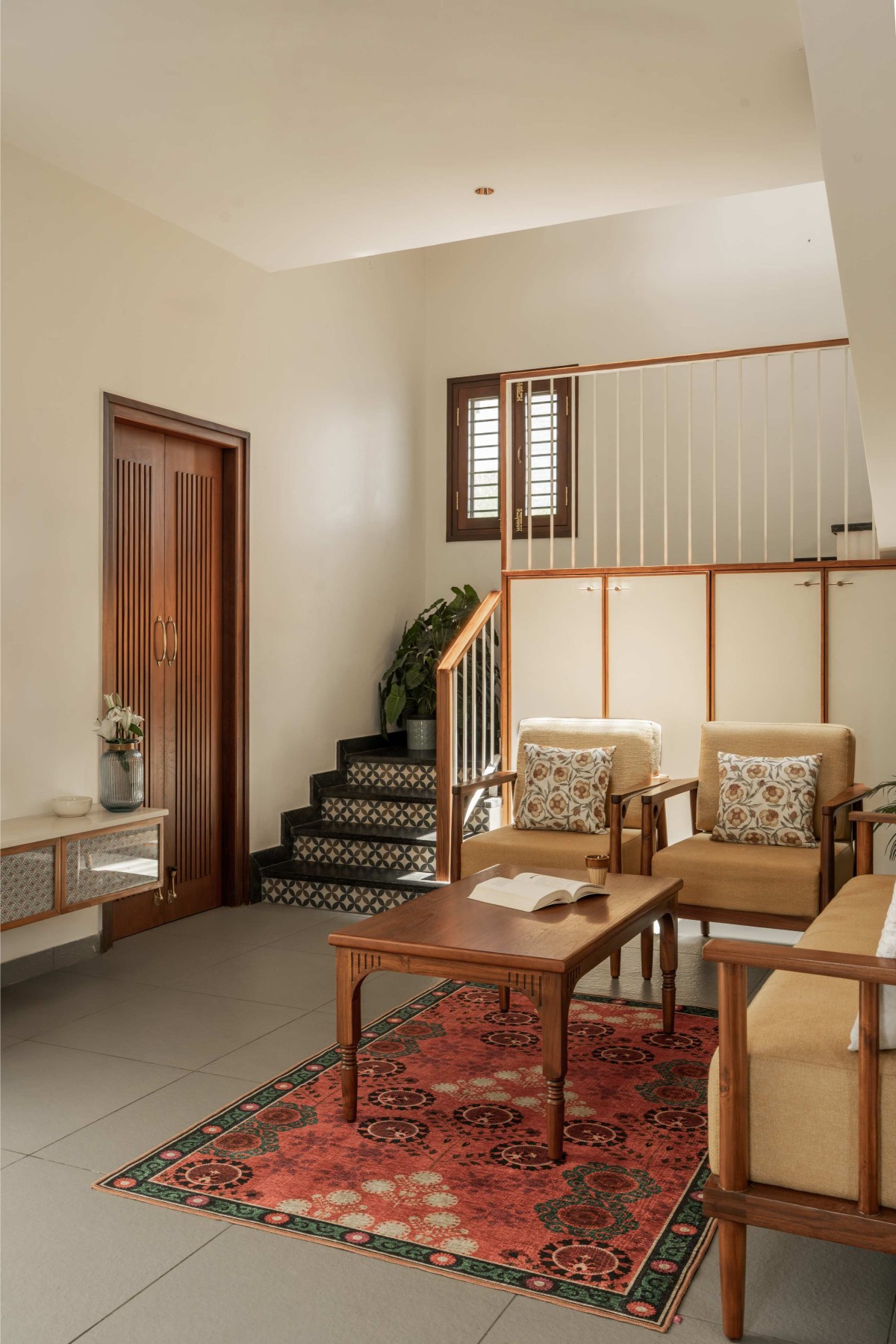 Bathed in natural sunlight throughout the day, the living room provided the perfect canvas for material exploration. The combination of Kota stone flooring and Athangudi tiles anchors the space, harmonizing the earthy tones and textures to bring the room to life.