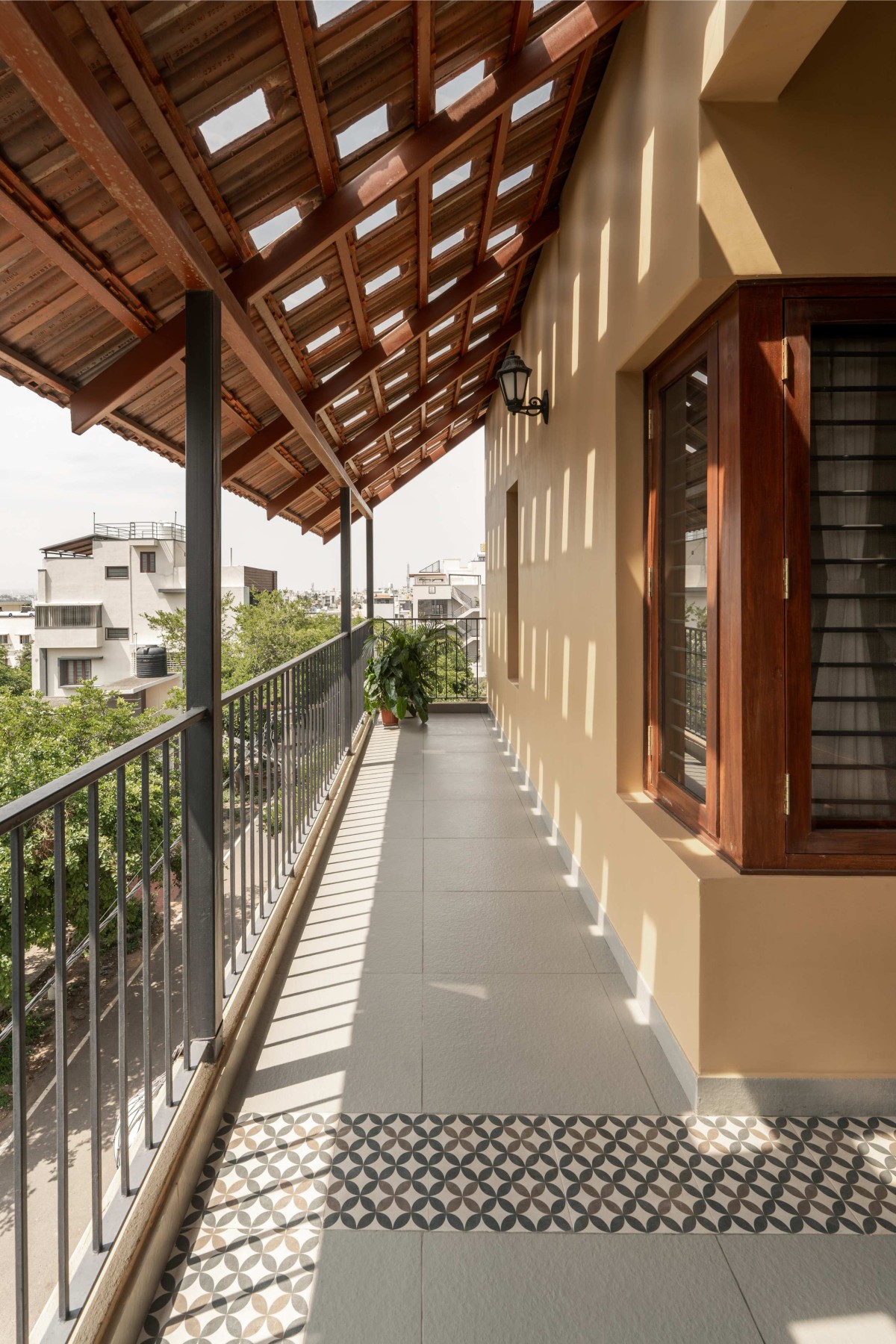 The second-floor sit-out offers the best of both worlds, overlooking lush greenery and the city skyline simultaneously. The grills and materials were deliberately kept subtle to maximize the sense of openness in the space.