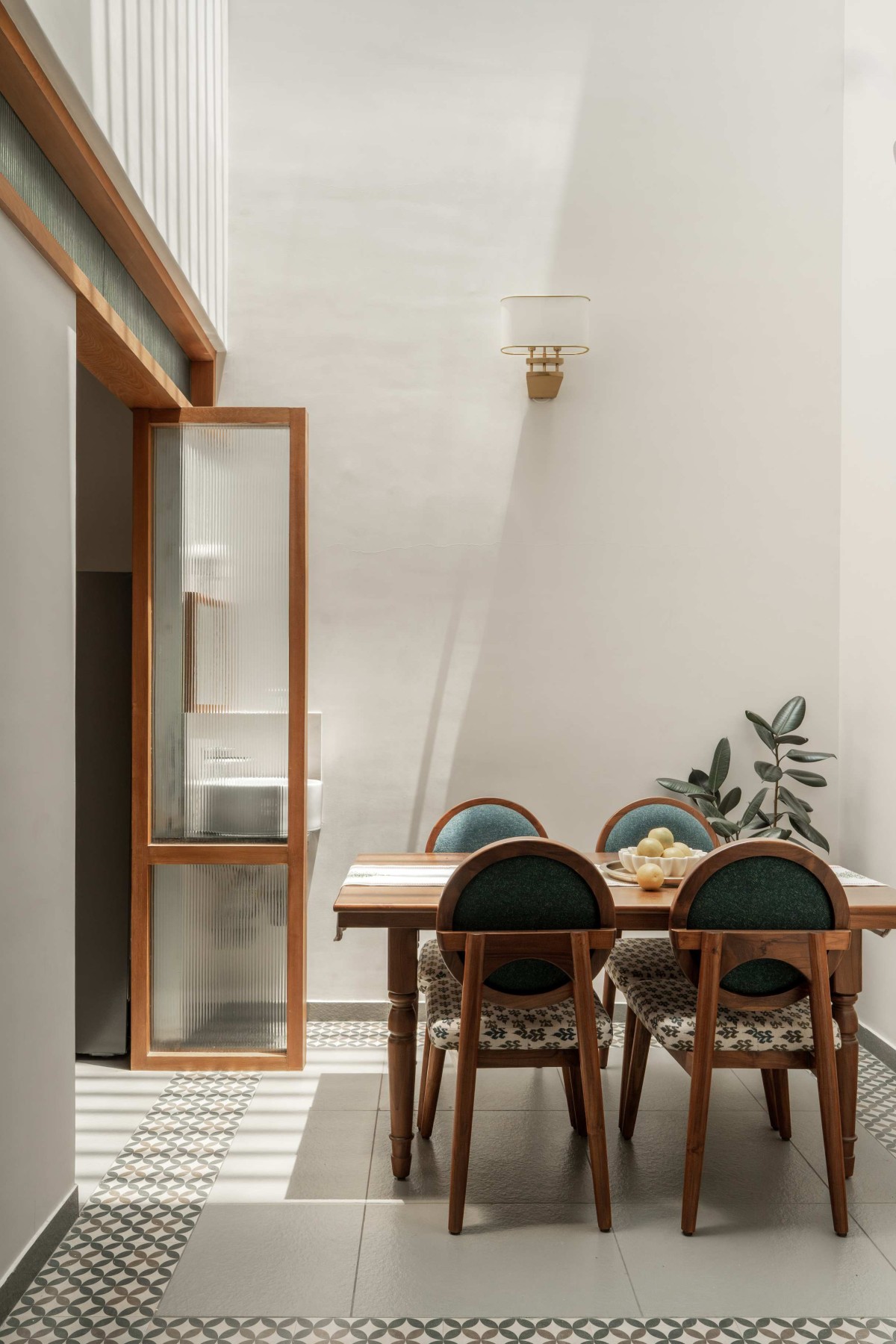 Compact yet highly functional, the dining room seamlessly blends with the natural sunlight, creating a space that feels both cozy and bright. Fluted glass partitions and thoughtfully selected furniture elevate the space, making it a truly stunning corner of the home.