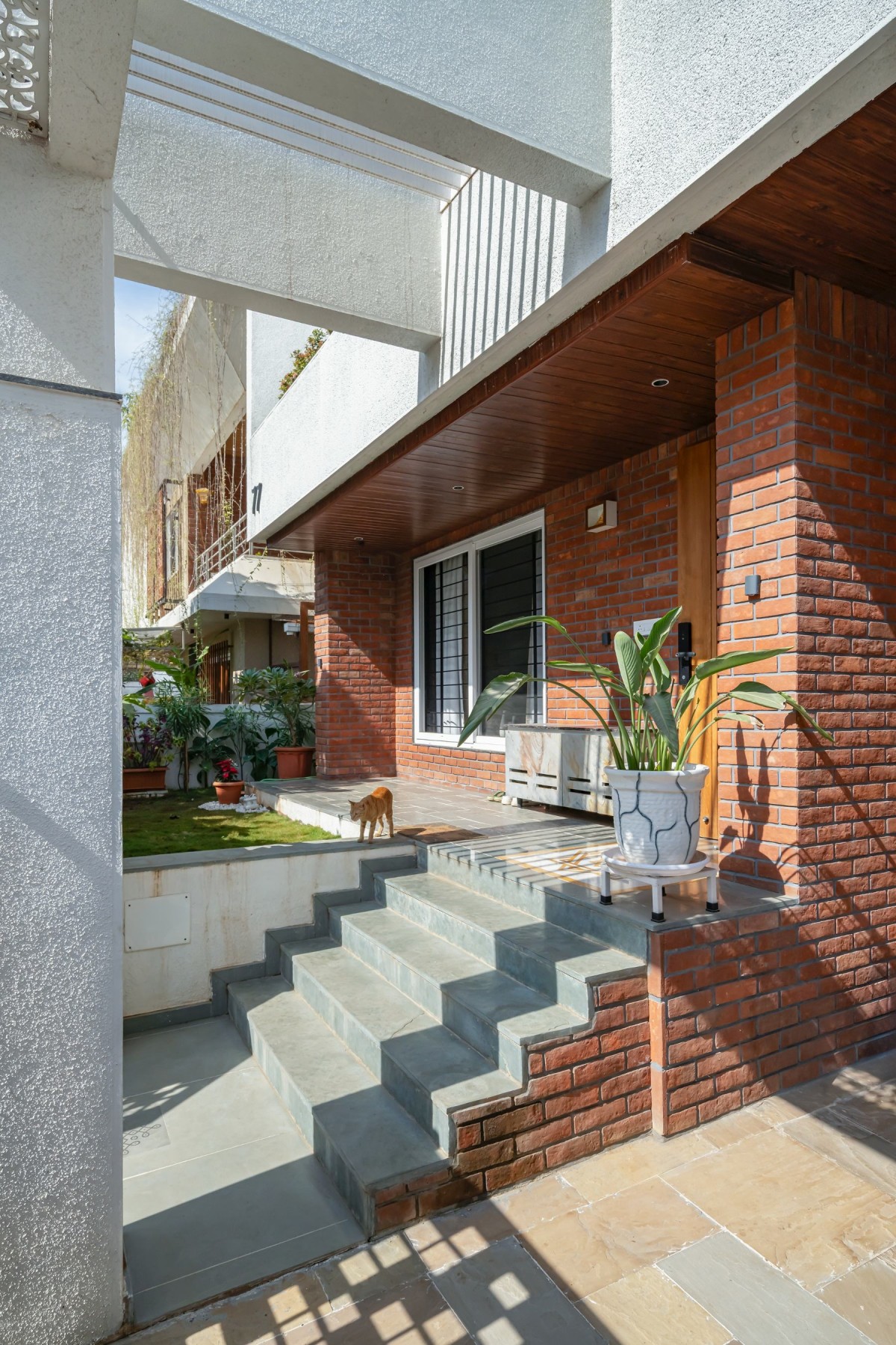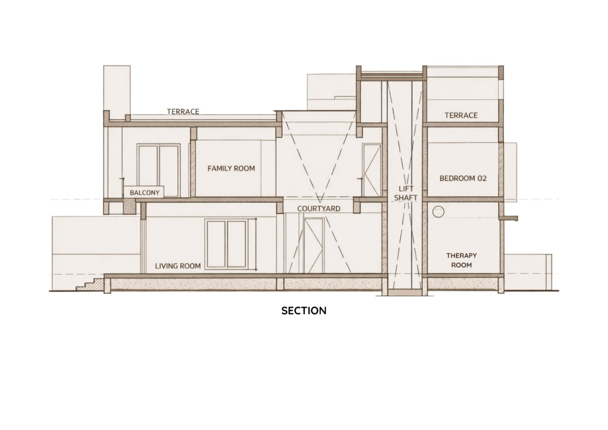 Material selection remains restrained and purposeful. Kota stone flooring was chosen for its durability, thermal comfort, and understated character, lending continuity across spaces. Granite is used for copings and framing elements, providing robustness at points of contact and exposure. Glass railings maintain visual lightness, reinforcing vertical connectivity around the courtyard. The façade incorporates brick cladding, grounding the exterior expression and introducing material depth without excess ornamentation.