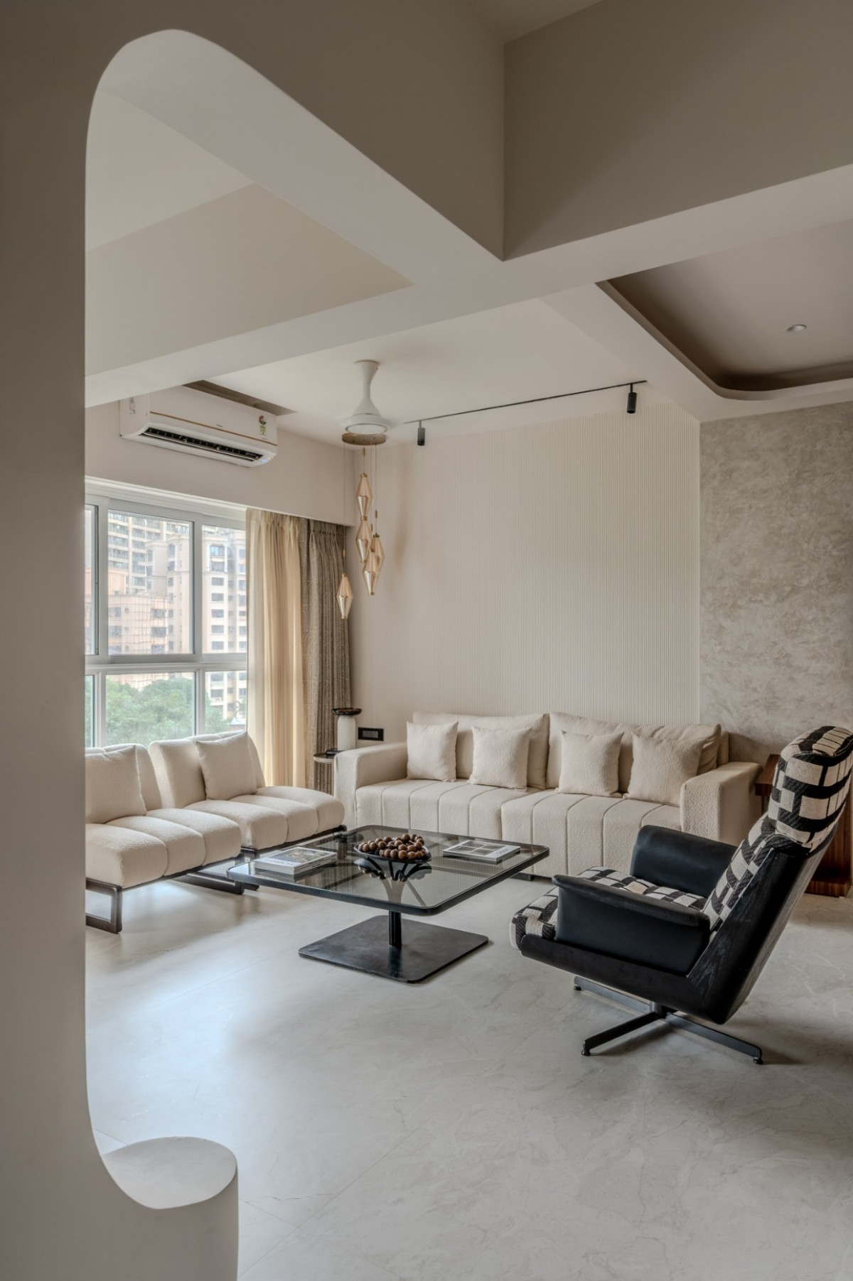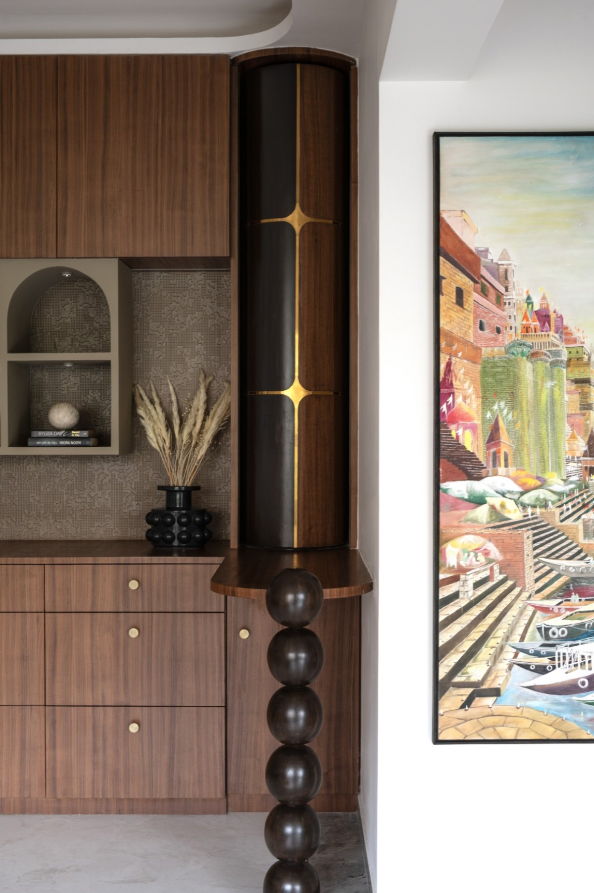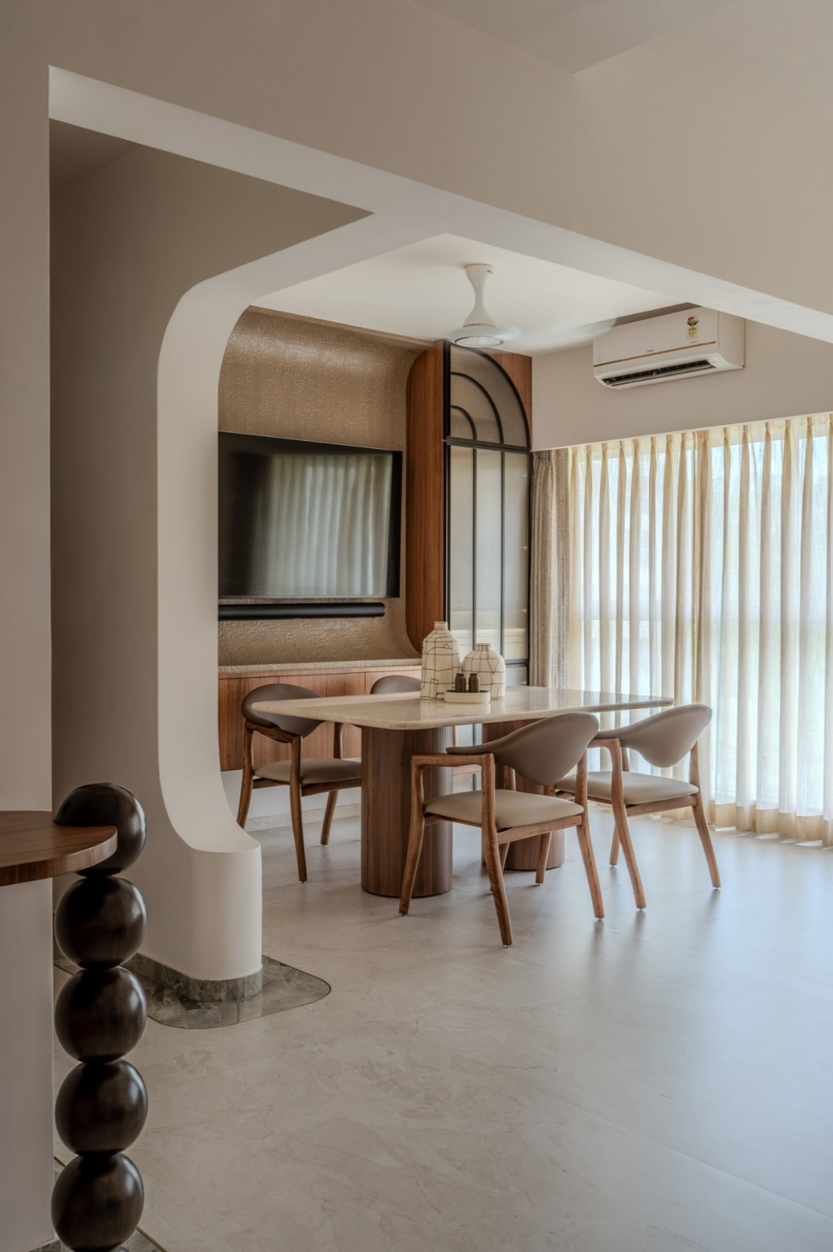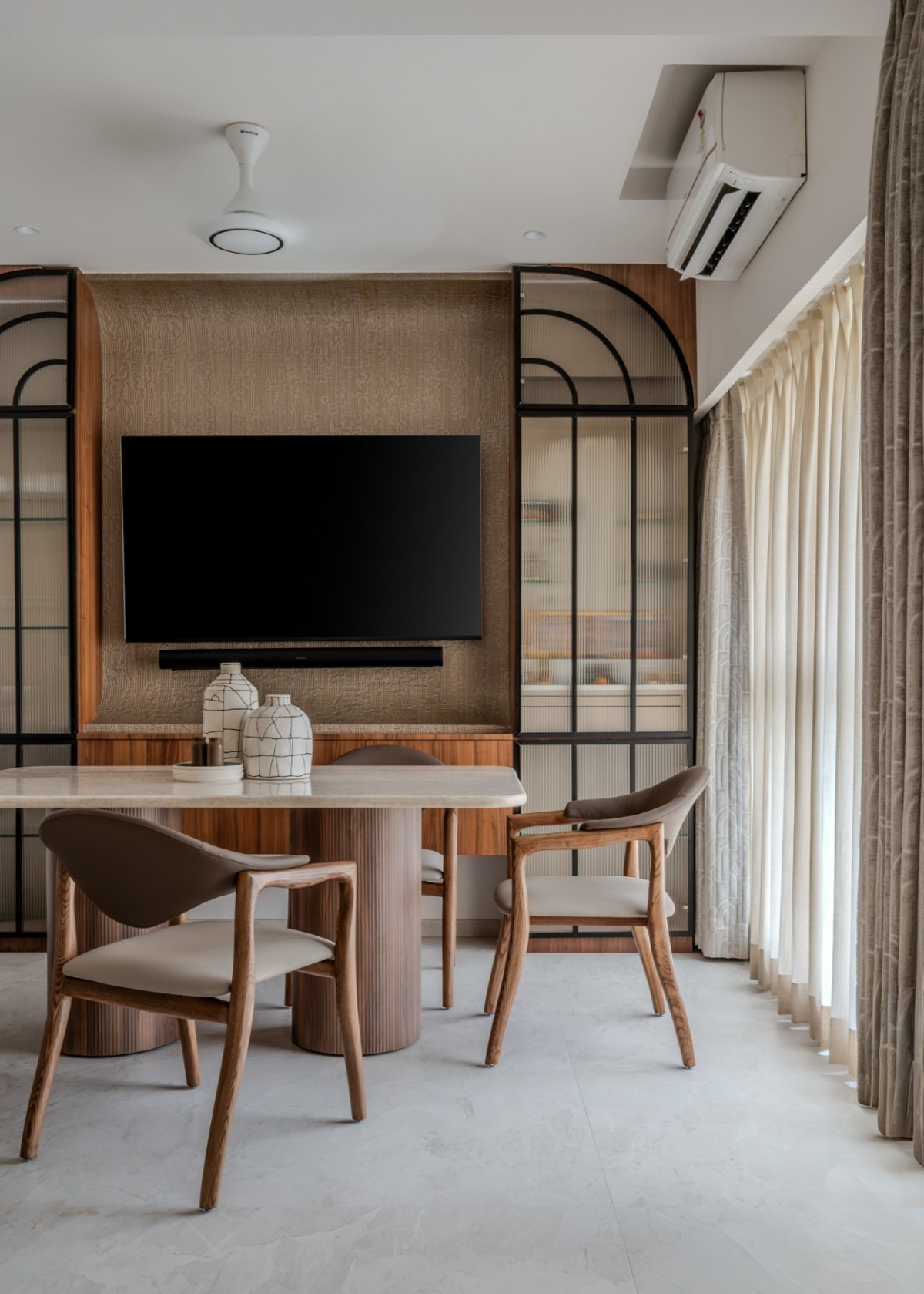 The nucleus of the home is finished in matte PU veneer, MDF flutes, texture paint, and CNC-cut veneer highlights. A sculptural bar unit defines this space, crafted with brass inlays and supported on interlocked teak spheres, making it both ergonomic and dramatic. Fluted glass with MS profiles adds a layer of refinement. All furniture was custom-designed to fit proportions precisely, ensuring cohesion.
